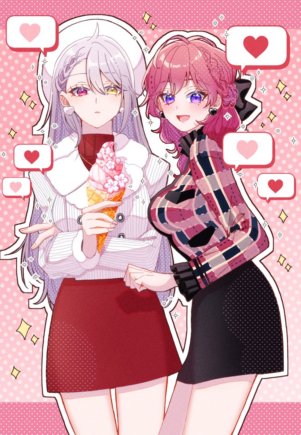2girls black_skirt blush chloe_collins closed_mouth food genderswap genderswap_(mtf) grey_hair heart heterochromia highres holding holding_food holding_ice_cream ice_cream long_hair looking_at_viewer mahoutsukai_no_yakusoku medium_hair multiple_girls nacho_nacho0112 open_mouth owen_(mahoutsukai_no_yakusoku) pink_background purple_eyes red_eyes red_hair red_skirt skirt smile speech_bubble spoken_heart yellow_eyes