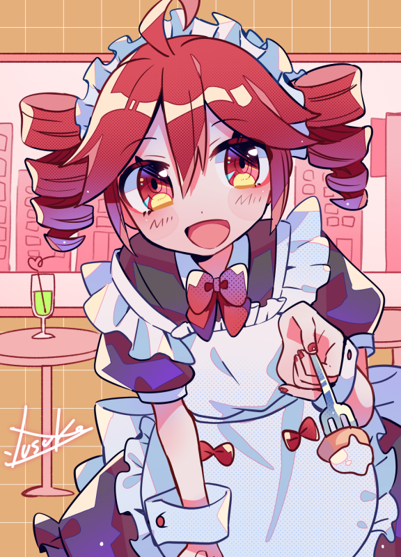 1girl ahoge apron artist_name back_bow black_dress blush bow dress drill_hair fork glass grid_background hair_between_eyes holding holding_fork kasane_teto looking_at_viewer maid maid_apron maid_headdress open_mouth orange_background pov red_bow red_eyes red_hair sidelocks signature smile solo table grid_background twin_drills utau white_bow window yuusuke-kun