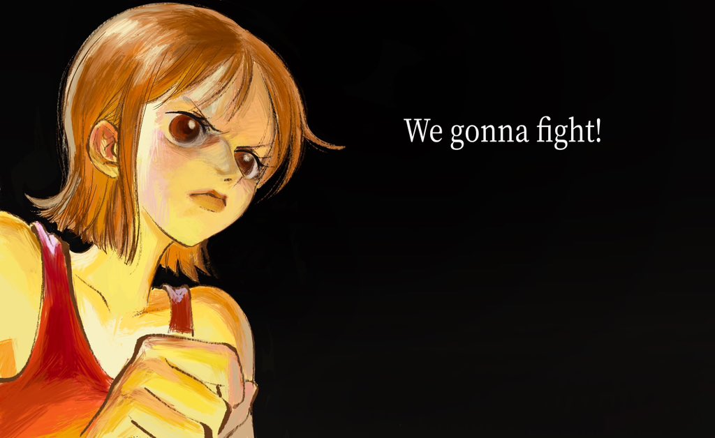 1girl angry black_background clenched_hand commentary english_text linerynlasgalen looking_ahead nami_(one_piece) one_piece orange_eyes orange_hair red_tank_top short_hair sidelocks solo untranslatable_commentary tank_top upper_body