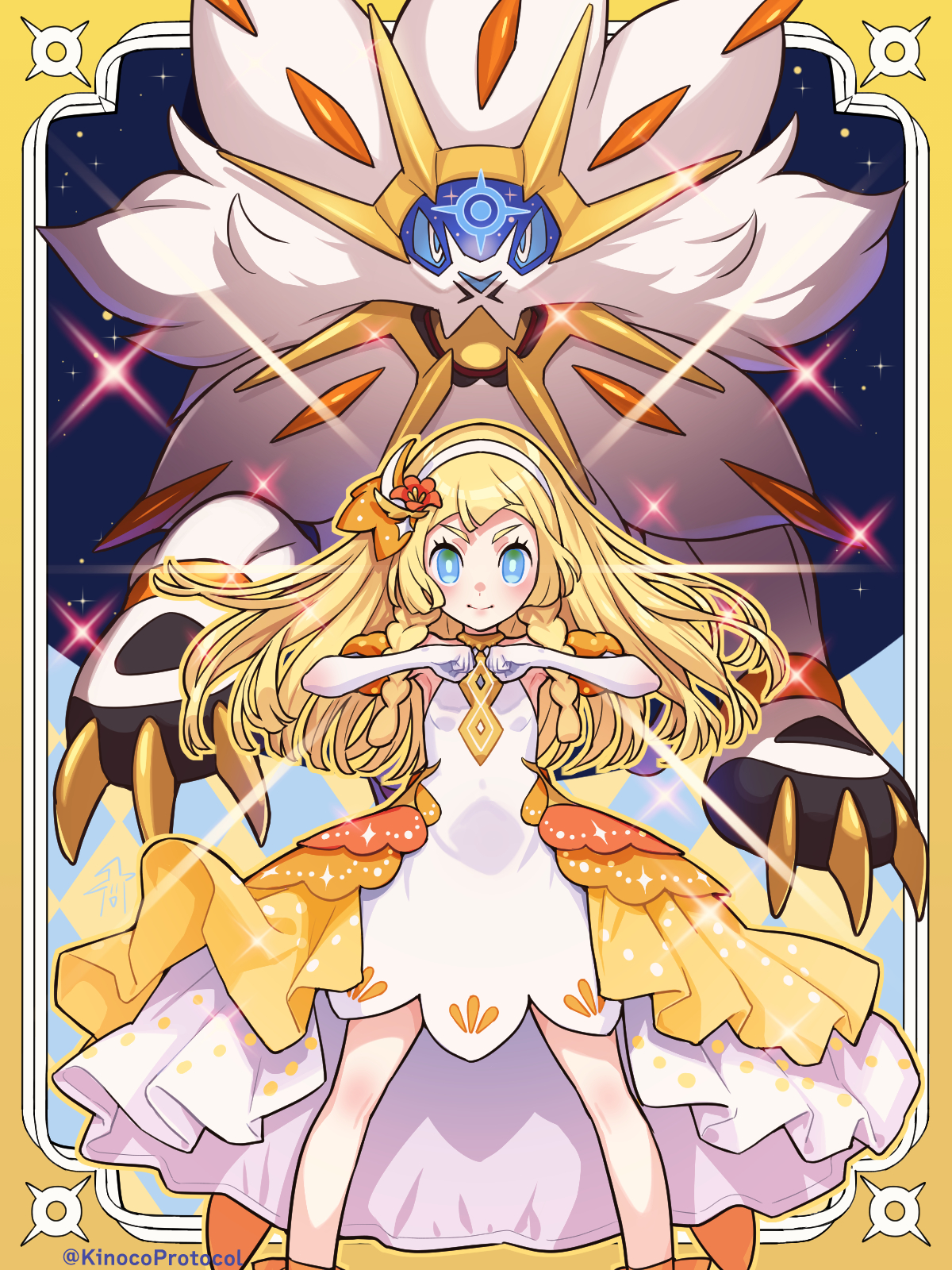 1girl alternate_color blonde_hair blush bright_pupils closed_mouth commentary_request dress elbow_gloves eyelashes flower frills gen_7_pokemon gloves hair_flower hair_ornament hairband hands_up highres kinocopro knees legendary_pokemon legs_apart lillie_(anniversary_2021)_(pokemon) lillie_(anniversary_2024)_(pokemon) lillie_(pokemon) long_hair looking_at_viewer nintendo official_alternate_costume orange_flower pokemon pokemon_(creature) pokemon_masters_ex sleeveless sleeveless_dress smile solgaleo standing twitter_username watermark white_dress white_gloves white_hairband white_pupils