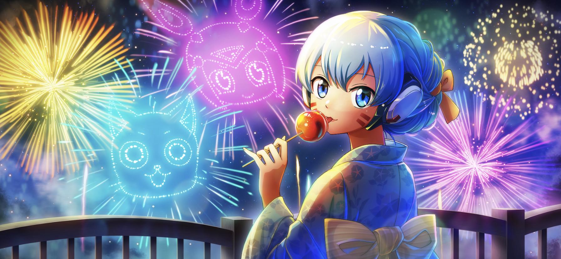 1girl blue_eyes eden's_zero fireworks happy_(eden's_zero) hermit_mio highres japanese_clothes official_art pino_(eden's_zero) solo