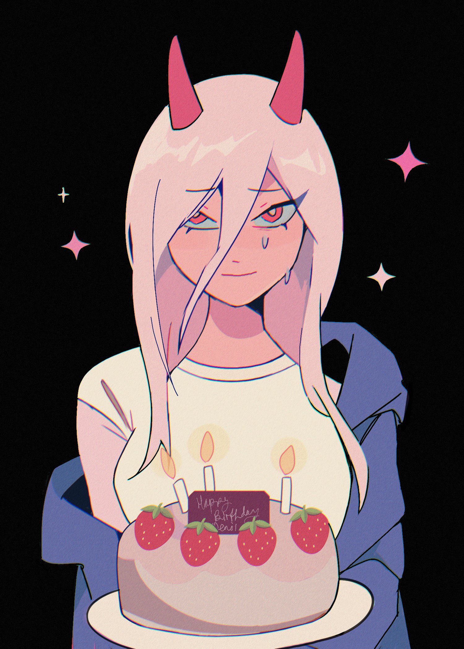 1girl black_background blue_hoodie candle chainsaw_man commentary english_commentary food fruit hair_between_eyes happy_birthday highres holding holding_plate hood hoodie horns long_hair looking_at_viewer milkoe pink_hair plate power_(chainsaw_man) red_horns shirt solo star_(symbol) strawberry sweatdrop t-shirt upper_body white_shirt