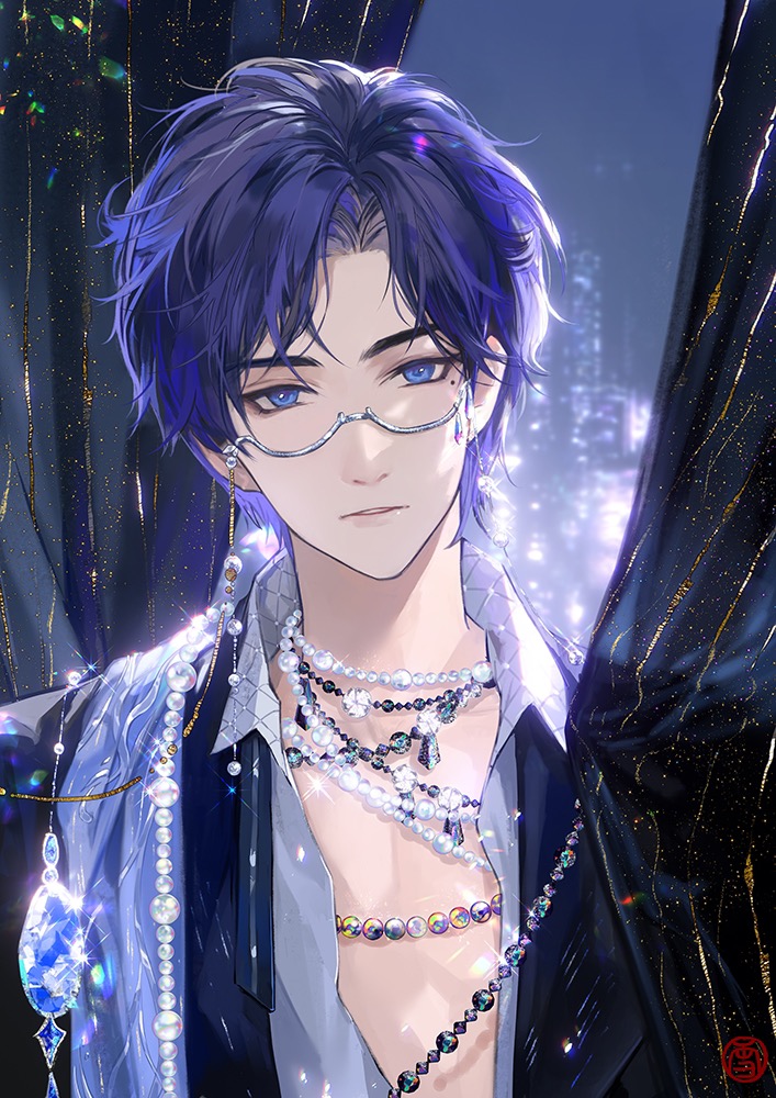 1boy black_gem black_jacket blue_gem blue_hair building city clarence_clayden clarence_clayden_(bejeweled_heart) collared_shirt curtain_grab curtained_hair curtains dark_blue_hair eyewear_strap gem glint grey-framed_eyewear indoors jacket jewelry looking_at_viewer lovebrush_chronicles male_focus mole mole_under_eye necklace night open_clothes open_jacket parted_bangs parted_lips partially_unbuttoned pearl_(gemstone) semi-rimless_eyewear shirt short_hair solo under-rim_eyewear upper_body white_gem white_shirt window xuedaixun