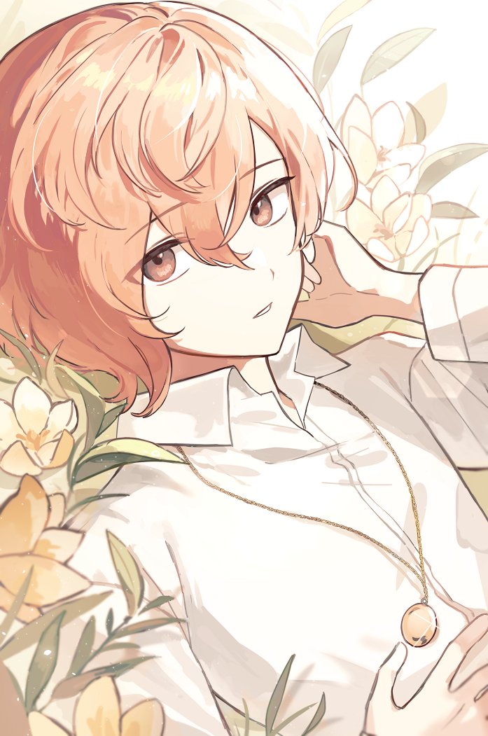 1boy brown_eyes collared_shirt floral_background flower gold_necklace goo_ouob grey_background jewelry looking_at_viewer lying male_focus miyama_kei necklace on_back orange_hair paradox_live shirt short_hair solo white_shirt yellow_flower