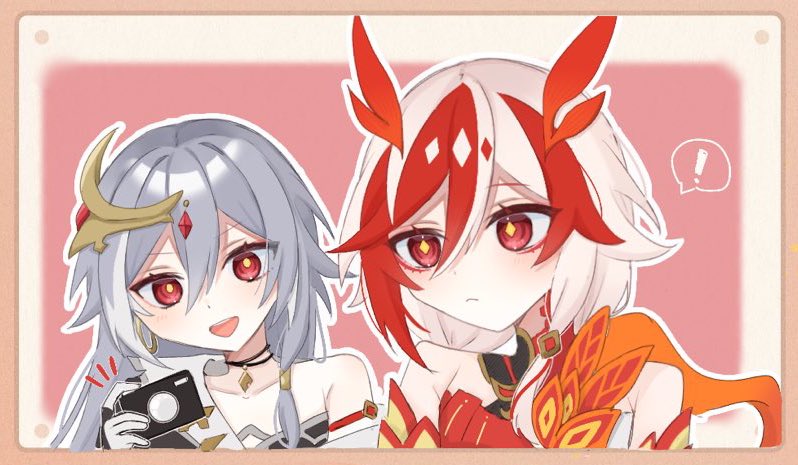 ! 2girls asymmetrical_clothes bare_shoulders belt black_choker black_dress camera china_dress chinese_clothes choker closed_mouth detached_sleeves dress elbow_gloves eyeliner fu_hua fu_hua_(garuda) herrscher_of_sentience gloves grey_hair hair_between_eyes hair_ornament hanfu holding holding_camera honkai_(series) honkai_impact_3rd jewelry long_hair looking_at_object low-tied_long_hair low_twintails makeup multicolored_hair multiple_girls open_mouth red_eyeliner red_eyes red_gloves red_hair red_rope red_scales rope single-shoulder_dress single_bare_shoulder single_off_shoulder streaked_hair symbol-shaped_pupils twintails two-tone_hair upper_body white_gloves white_hair xtx_mercury yellow_belt yellow_pupils