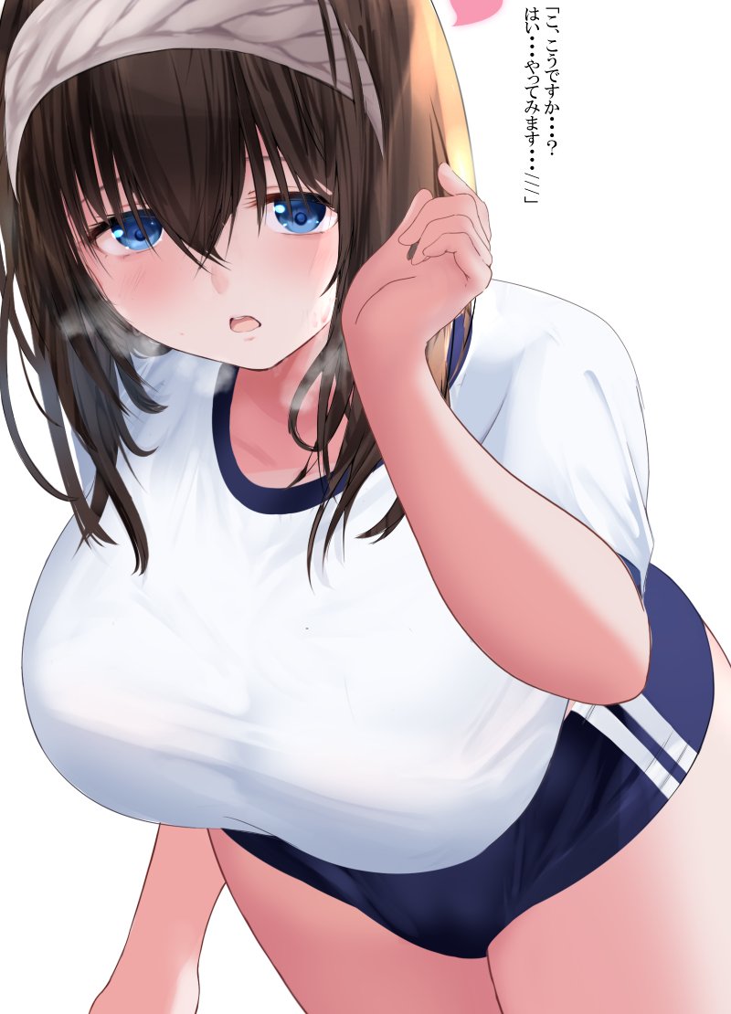 1girl black_hair blue_eyes blush breasts hairband idolmaster idolmaster_cinderella_girls large_breasts long_hair ponytail_korosuke sagisawa_fumika sportswear sweat white_hairband
