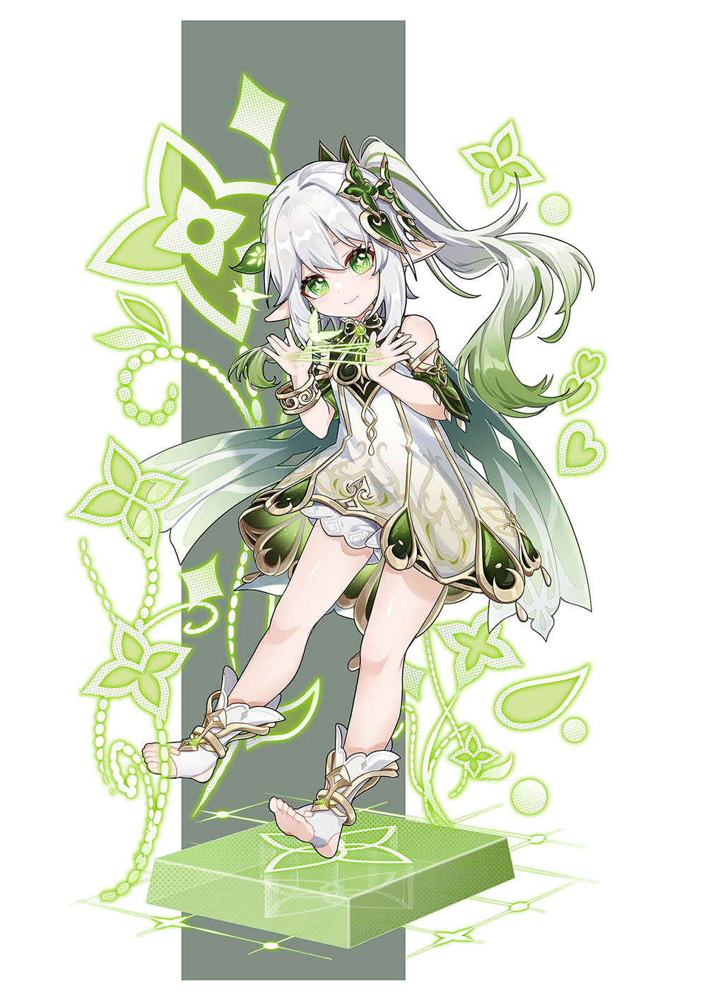 1girl anklet closed_mouth dress full_body genshin_impact gradient_hair green_eyes green_hair highres jewelry lily030988 looking_at_viewer multicolored_hair nahida_(genshin_impact) pointy_ears side_ponytail sleeveless sleeveless_dress smile solo symbol-shaped_pupils white_dress white_hair