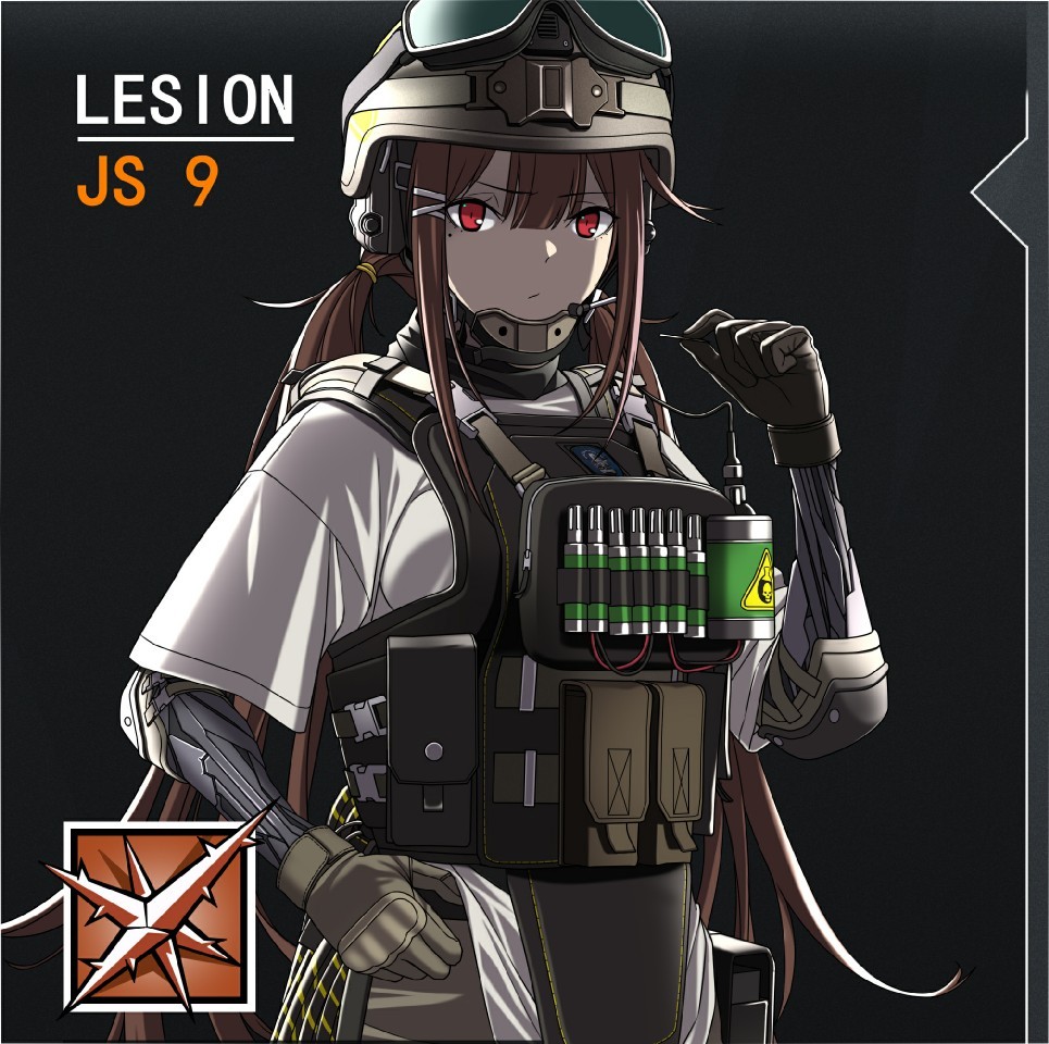 1girl alternate_costume black_gloves brown_hair character_name closed_mouth commentary_request expressionless girls'_frontline gloves goggles goggles_on_headwear hair_between_eyes helmet js_9_(girls'_frontline) lesion_(rainbow_six_siege) load_bearing_vest long_hair mechanical_arms parody rainbow_six_siege red_eyes sidelocks solo upper_body yitiao_er-hua