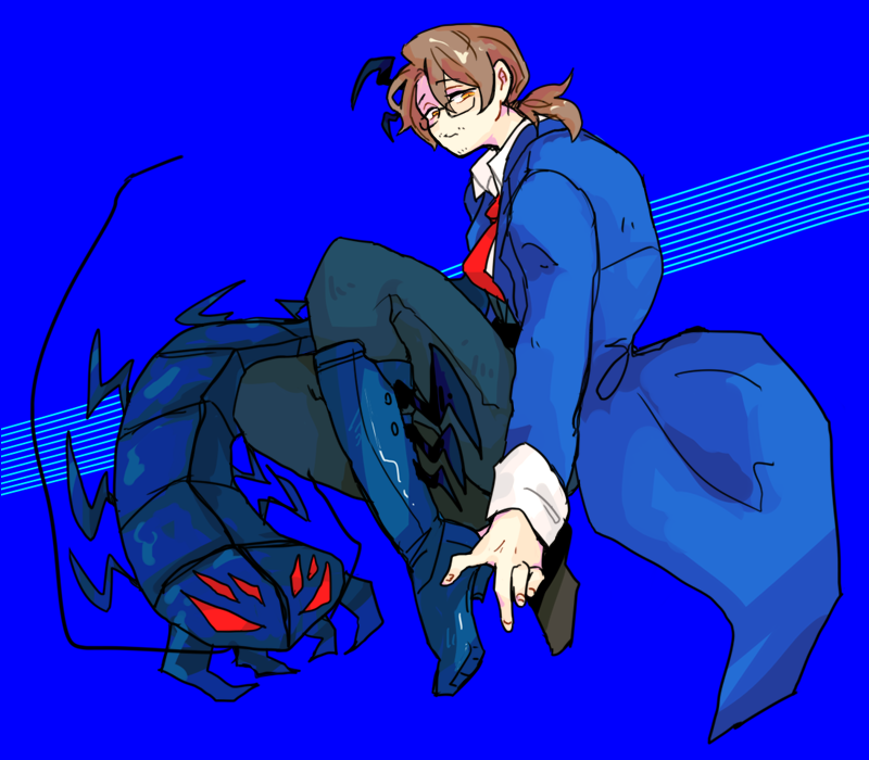 1boy aedd_(e.g.o) blue_background blue_boots blue_coat boots brown_eyes brown_hair coat e.g.o_(project_moon) facial_hair gregor_(project_moon) hcc1bai knees_up limbus_company long_sleeves looking_at_viewer low_ponytail medium_hair ponytail project_moon shock_centipede_(project_moon) simple_background solo stubble