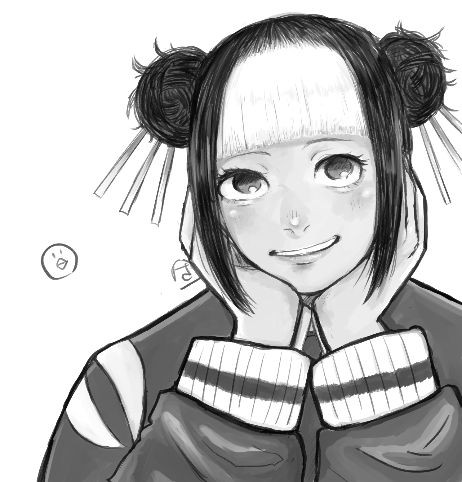 1girl blunt_bangs double_bun greyscale hair_bun head_rest highres hinao_(kagurabachi) jacket kagurabachi long_sleeves looking_at_viewer monochrome multicolored_hair sazakgr smile solo two-tone_hair upper_body