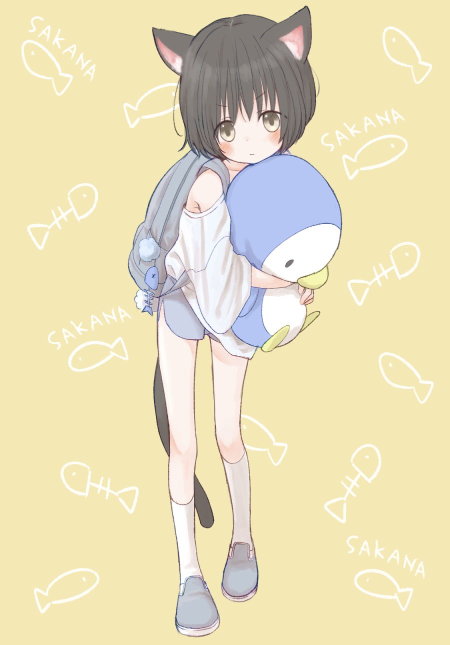 1girl animal_ears backpack bag black_hair blush cat_ears cat_girl cat_tail charm_(object) expressionless fish full_body grey_eyes highres holding holding_stuffed_toy looking_at_viewer loose_clothes loose_shirt original shirt short_hair short_shorts shorts single_bare_shoulder socks solo stuffed_animal stuffed_penguin stuffed_toy tail waramugu white_socks
