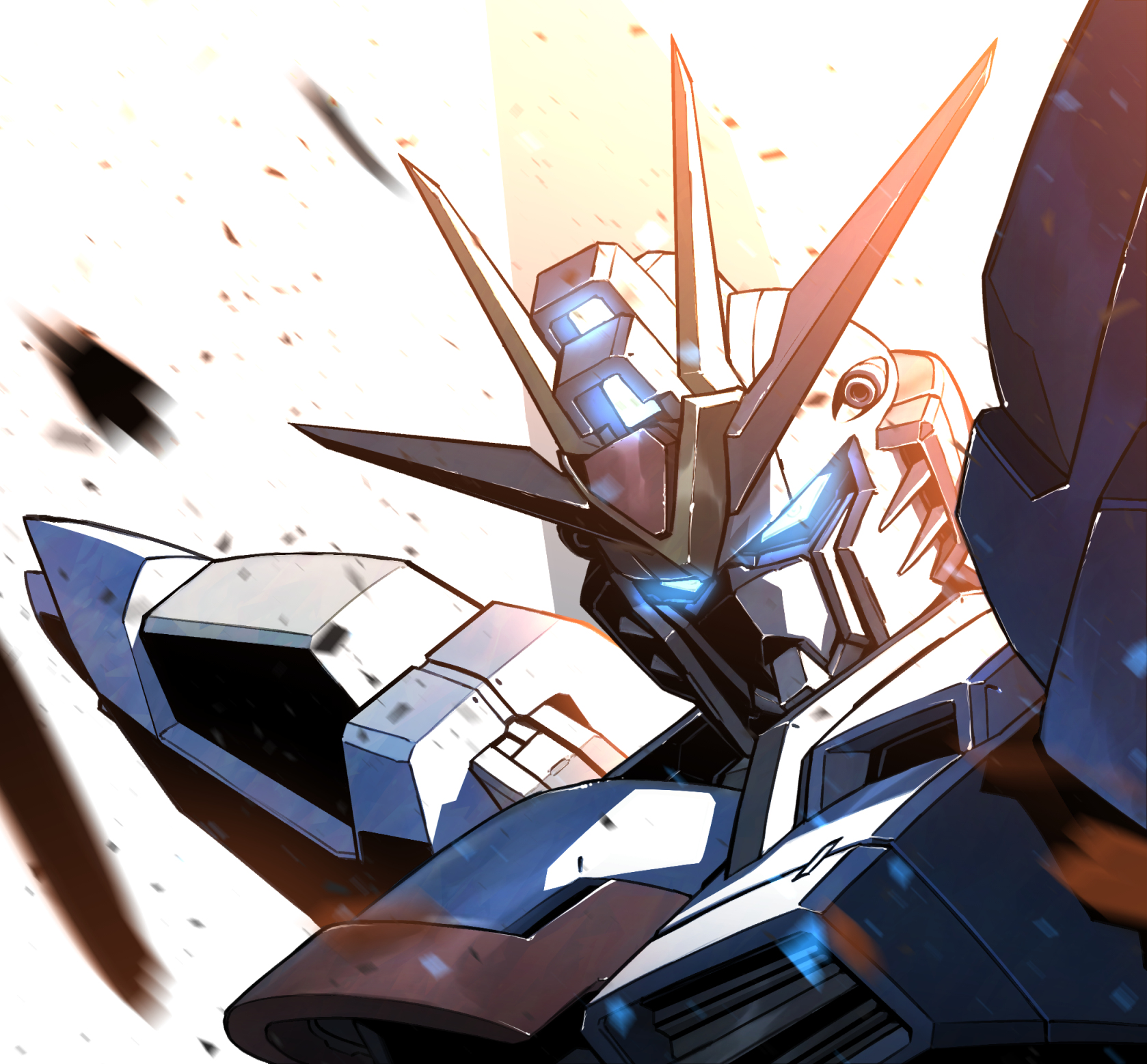 blue_eyes debris glowing glowing_eyes gundam gundam_seed gundam_seed_freedom highres kuri_giepi looking_at_viewer mecha mobile_suit motion_blur no_humans portrait rising_freedom_gundam robot science_fiction solo v-fin white_background