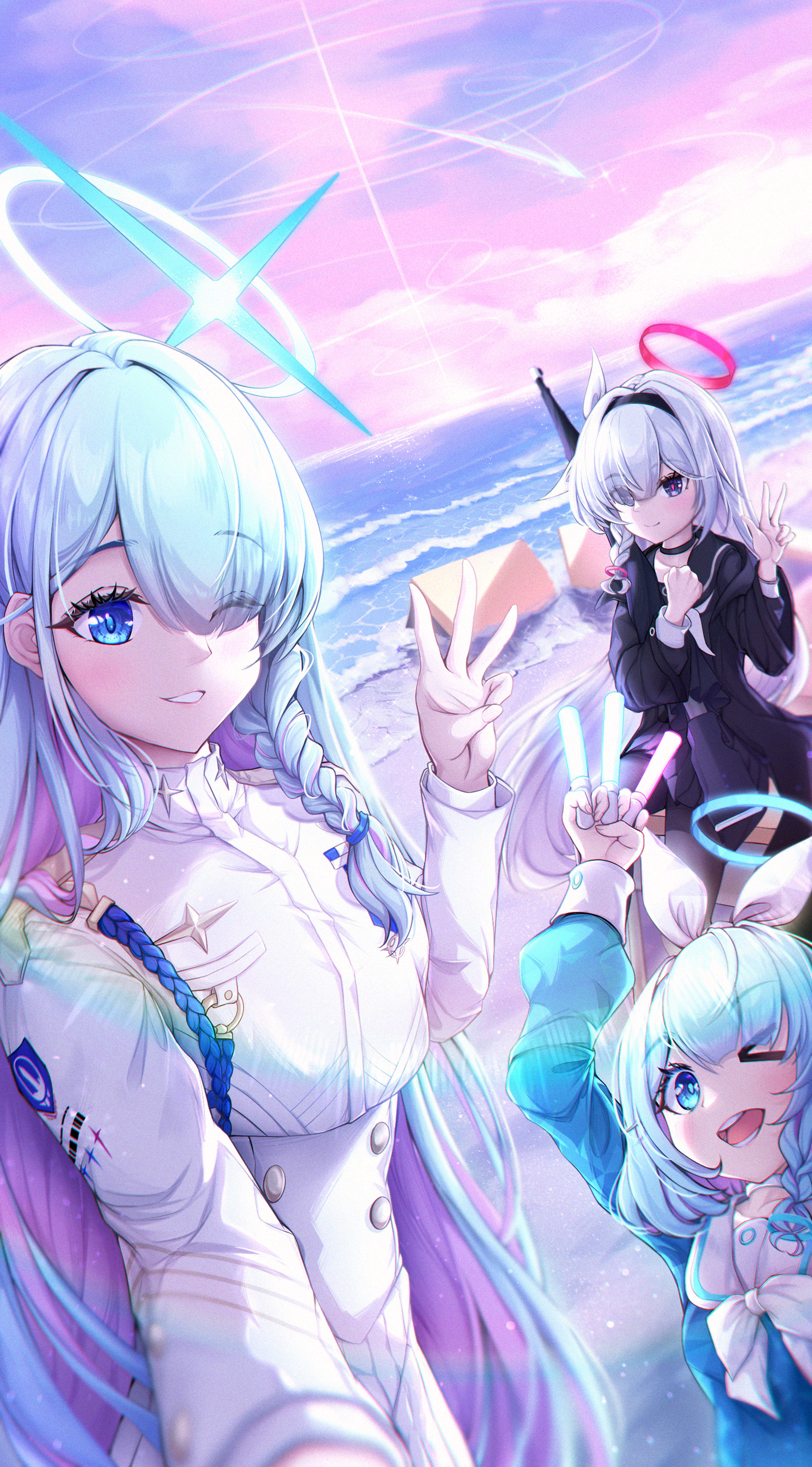 3girls absurdres arona_(blue_archive) beach black_choker black_eyes black_hairband black_sailor_collar black_serafuku blue_archive blue_eyes blue_hair blue_halo blush braid choker closed_mouth colored_inner_hair eyes_visible_through_hair general_student_council_president_(blue_archive) grey_hair grin hair_over_one_eye hairband halo highres long_hair long_sleeves multicolored_hair multiple_girls neckerchief norimori ocean one_eye_closed open_mouth pink_hair plana_(blue_archive) red_halo sailor_collar school_uniform serafuku short_hair single_braid smile white_choker white_neckerchief white_sailor_collar