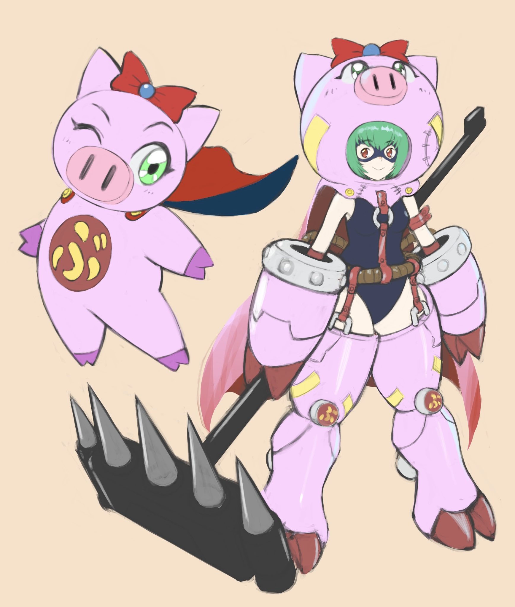 2girls animal_costume buurin_(tonde_buurin) cho-hakkaimon crossover digimon digimon_(creature) full_body hammer highres holding holding_weapon mas_square mask multiple_girls one_eye_closed pig_costume pig_girl spikes superhero_costume swimsuit tonde_buurin trait_connection weapon wink