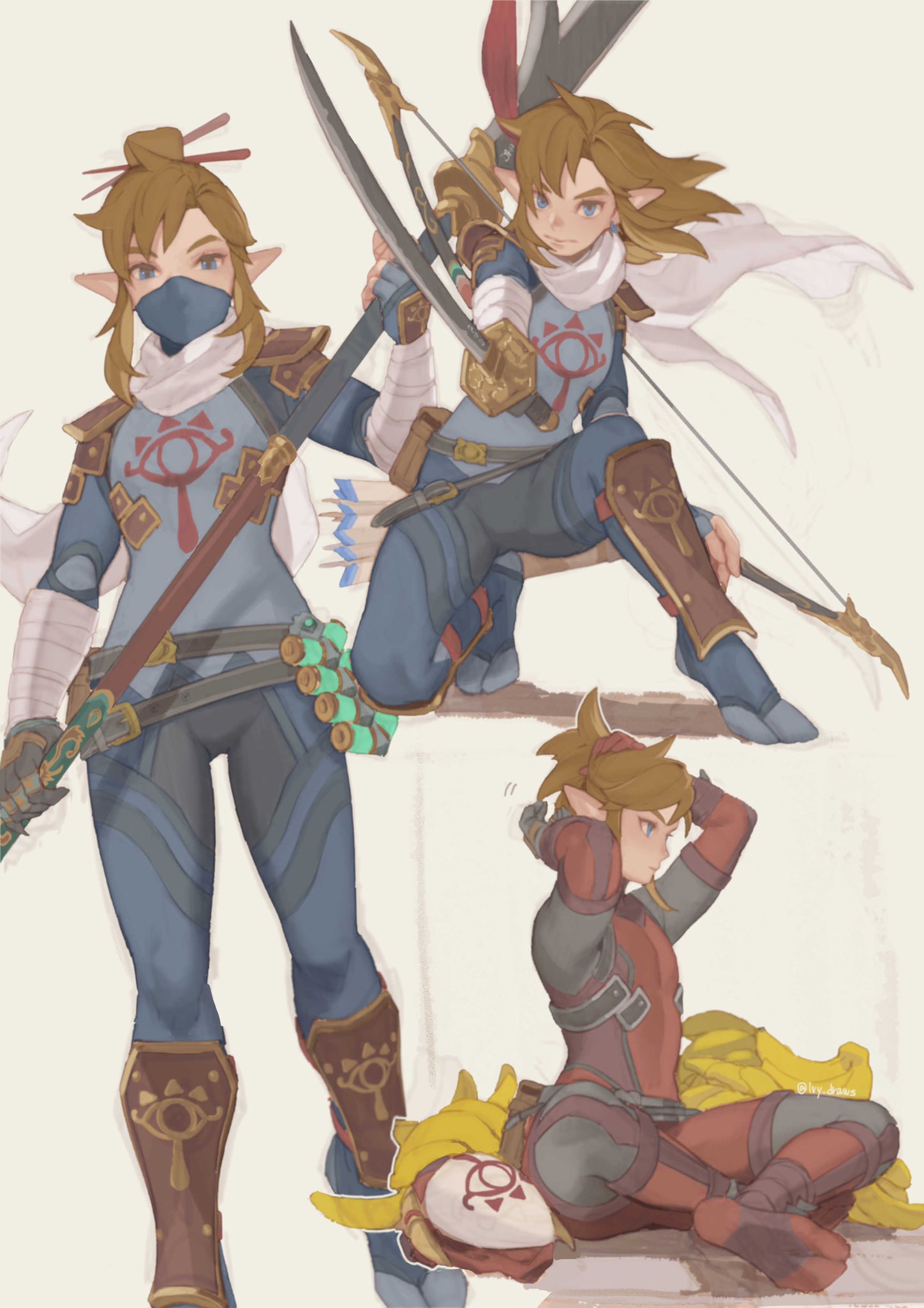 1boy black_bodysuit bodysuit bow_(weapon) brown_hair cosplay hair_ornament hair_stick hands_up highres holding holding_polearm holding_sword holding_weapon ivy_(sena0119) katana link long_hair male_focus mask mouth_mask multiple_views nintendo on_one_knee pointy_ears polearm purple_bodysuit red_bodysuit sitting stealth_set_(zelda) sword the_legend_of_zelda the_legend_of_zelda:_breath_of_the_wild unworn_mask weapon yiga_clan yiga_clan_footsoldier yiga_clan_footsoldier_(cosplay)