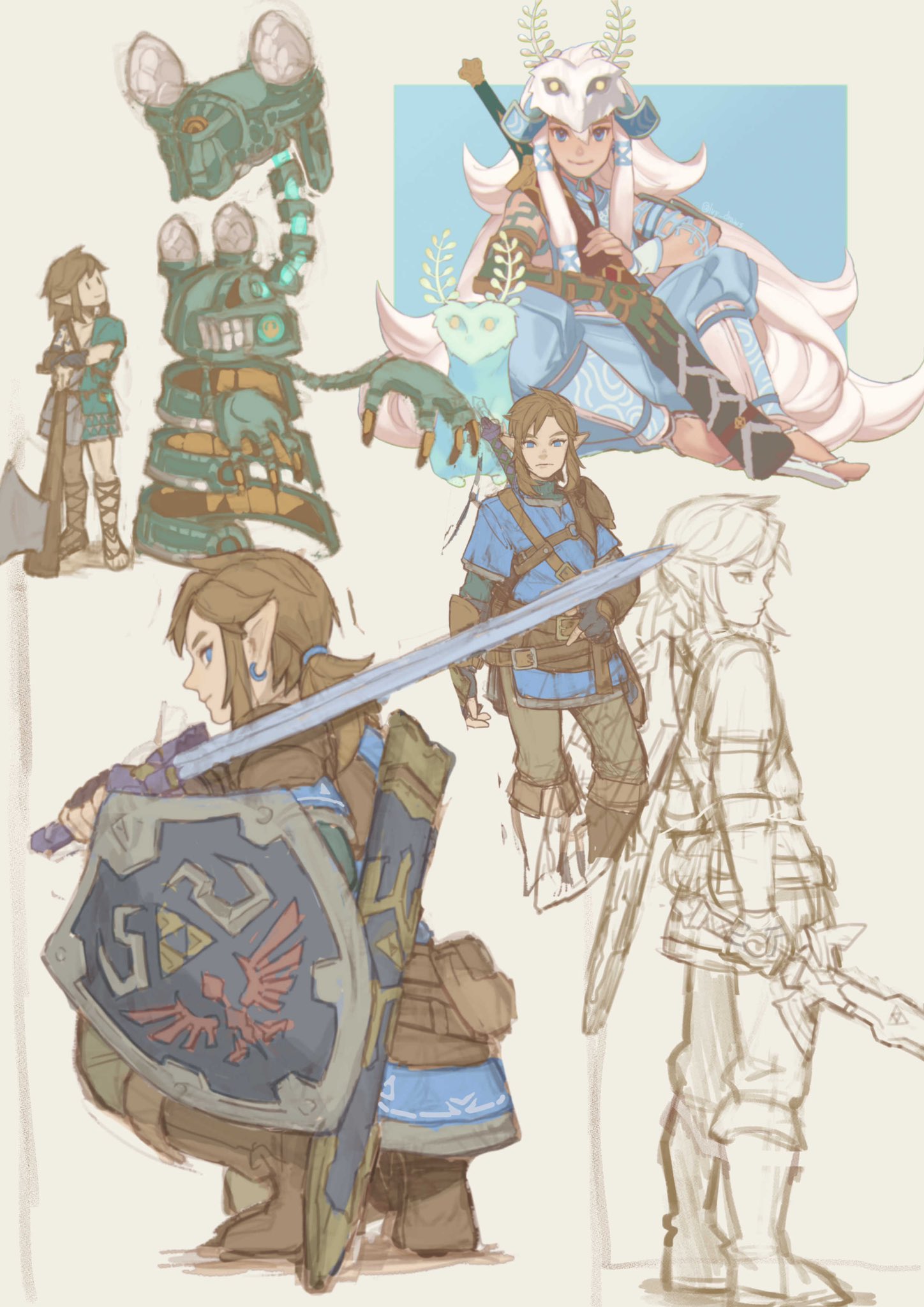 1boy axe blue_shirt brown_hair earrings highres holding holding_shield holding_sword holding_weapon hylian_shield ivy_(sena0119) jewelry layered_sleeves link long_sleeves male_focus multiple_views nintendo pointy_ears ponytail robot shield shirt short_over_long_sleeves short_sleeves sitting smile standing sword the_legend_of_zelda the_legend_of_zelda:_tears_of_the_kingdom weapon