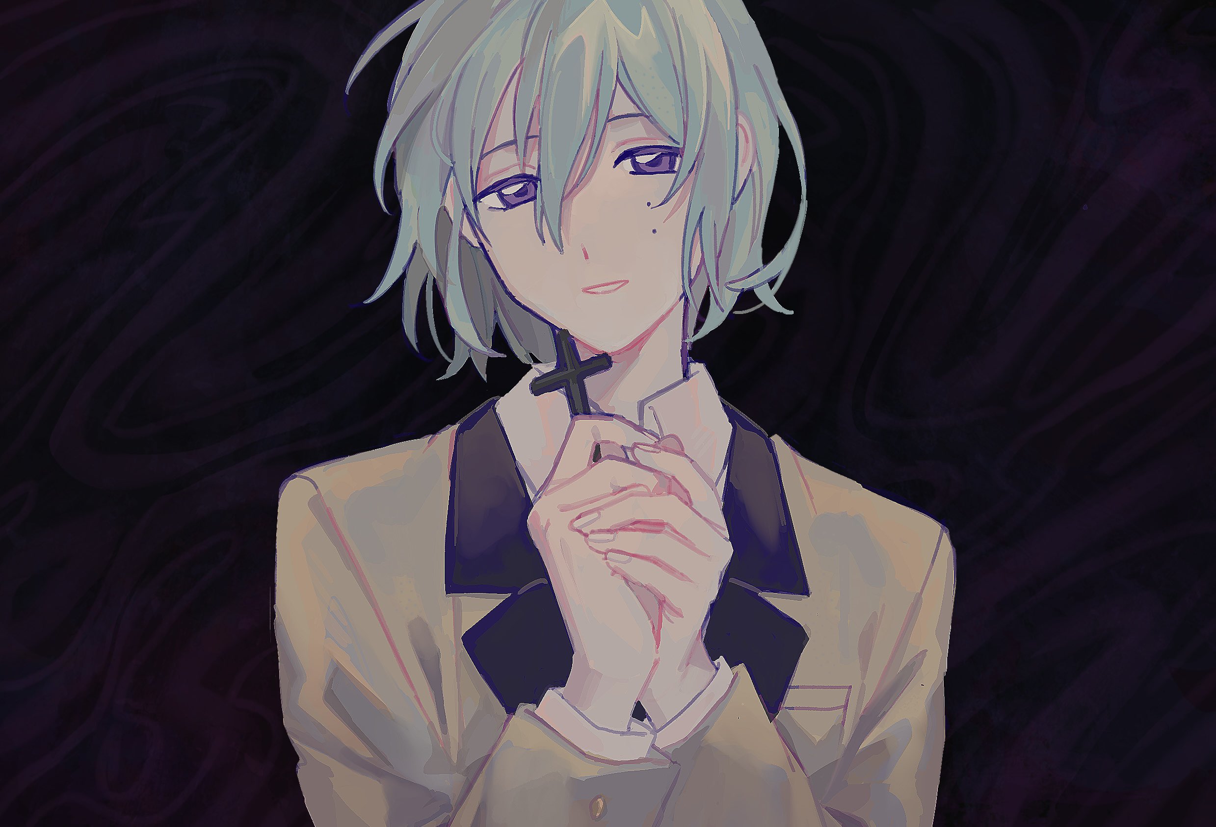 1boy aqua_hair black_background black_jacket blazer brown_jacket collared_shirt cross ensemble_stars! highres holding holding_cross jacket kazehaya_tatsumi kirokuyyyy long_sleeves looking_at_viewer male_focus mole mole_under_eye multicolored_jacket parted_lips purple_eyes shirt short_hair simple_background smile solo teeth white_shirt