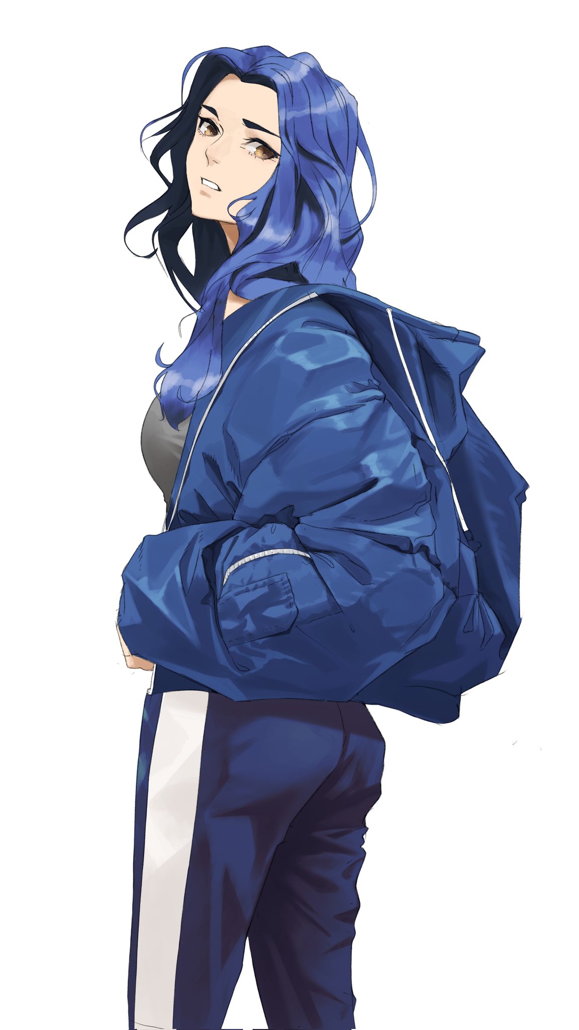 1girl bag blue_hair blue_jacket blue_pants breasts brown_eyes from_behind grey_shirt hair_over_shoulder highres jacket long_hair looking_at_viewer looking_back medium_breasts original pants parted_lips shirt simple_background solo striped_clothes striped_pants tbocart track_pants white_background