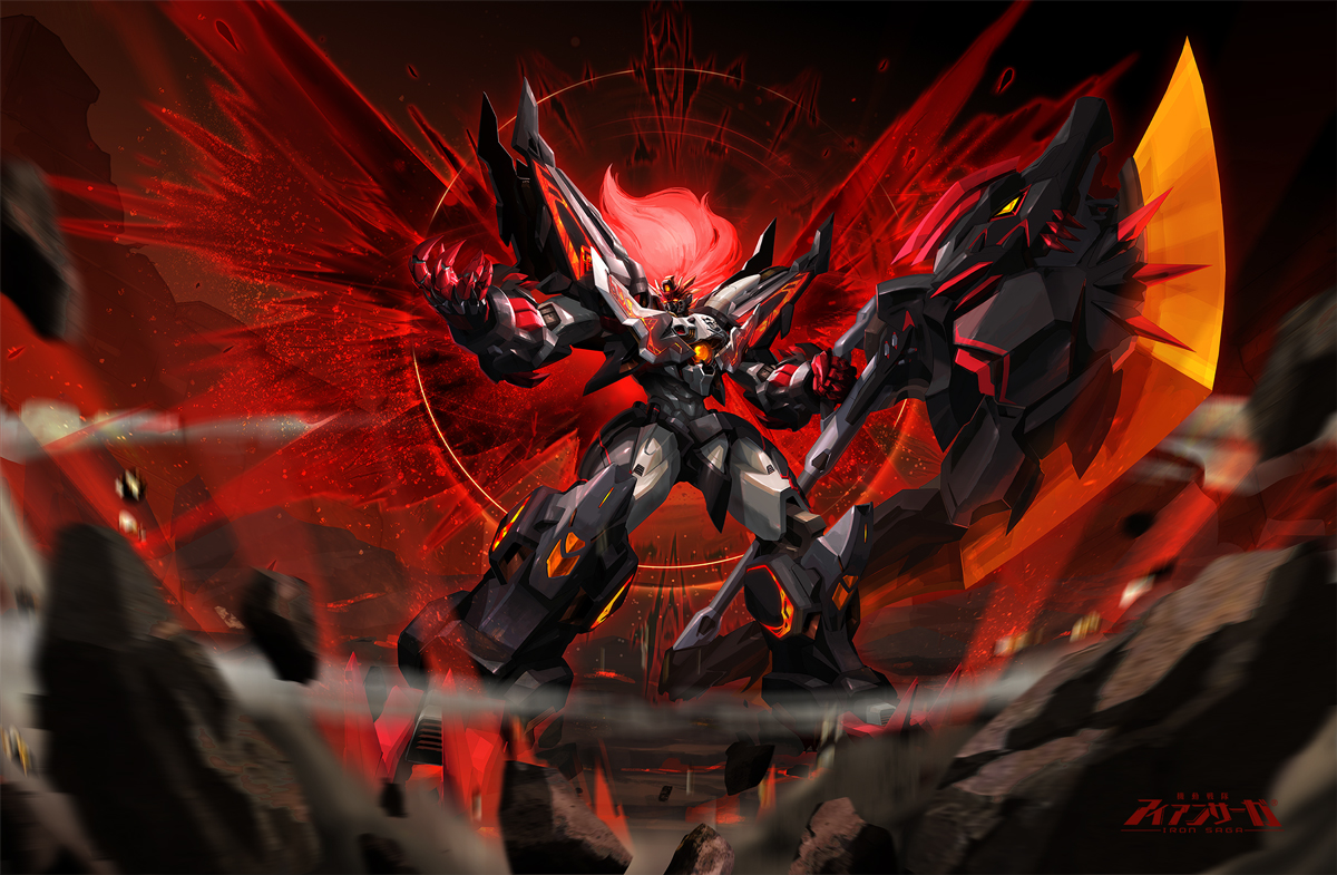 asmodeus_(iron_saga) axe copyright_name energy_wings holding holding_axe iron_saga logo mecha no_humans official_art robot science_fiction second-party_source