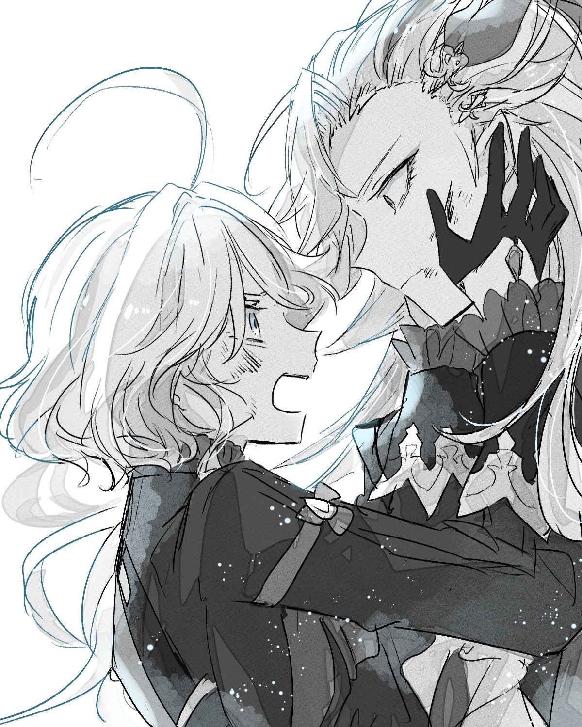 1boy 1girl ahoge bruise bruise_on_face closed_mouth feather_hair_ornament feathers furina_(genshin_impact) genshin_impact gloves greyscale hair_between_eyes hair_ornament hand_on_another's_face highres injury long_hair monochrome neuvillette_(genshin_impact) open_mouth ottottouta pointy_ears short_hair sidelocks simple_background upper_body white_background