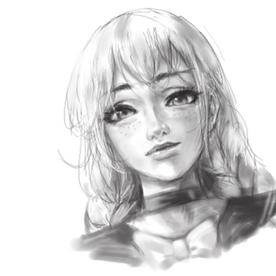 1girl bow bowtie braid choker closed_mouth cropped_head drawfag eyelashes freckles greyscale long_hair looking_at_viewer lowres monochrome oekaki original simple_background solo twin_braids white_background