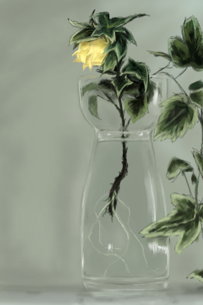 drawfag flower grey_background leaf no_humans oekaki original plant plant_roots still_life vase water yellow_flower