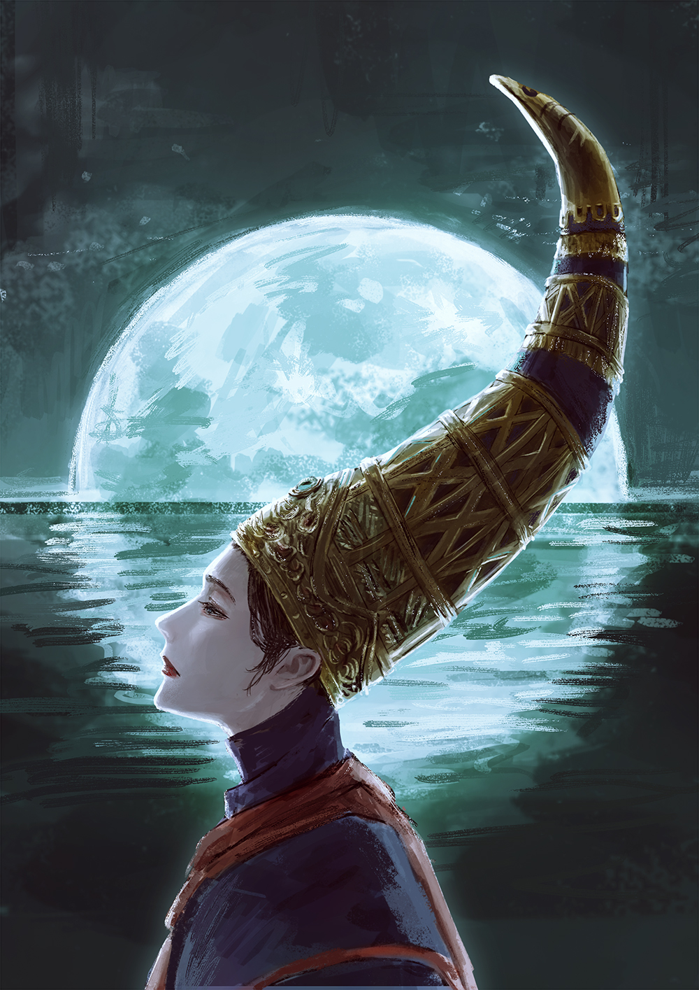 1girl brown_hair conical_hat elden_ring helmet highres large_hat menka_(menka_wata) moon ocean pale_skin profile red_lips rennala_queen_of_the_full_moon short_hair solo