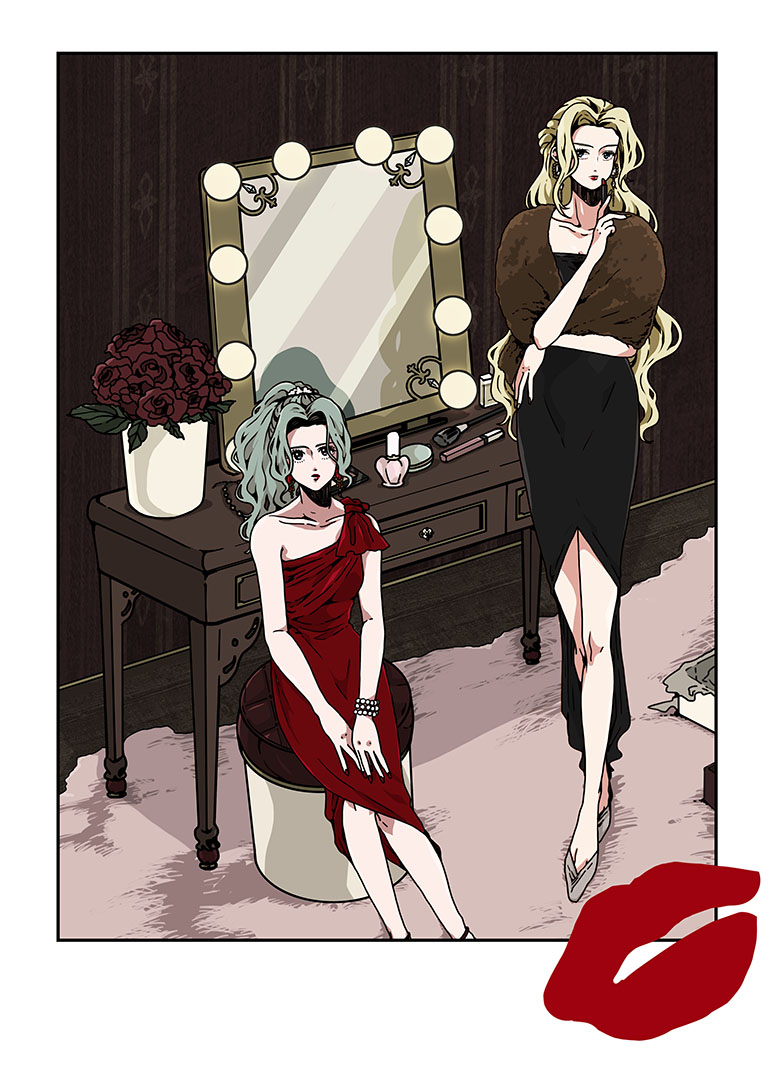 2girls ahtaso black_dress blonde_hair blue_eyes bracelet celes_chere coat dress earrings final_fantasy final_fantasy_vi flower fur_coat green_hair jewelry kiss long_hair makeup makeup_brush multiple_girls nail_polish ponytail red_dress red_flower red_rose ribbon rose sitting standing table tina_branford vanity_table