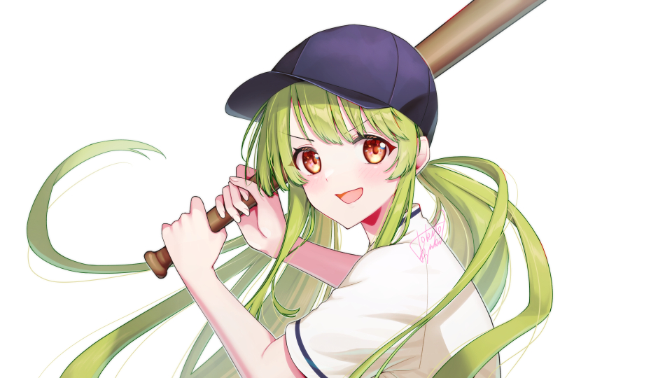 1girl baseball_bat baseball_cap blush character_request commission copyright_request from_side green_hair hat holding holding_baseball_bat long_hair low_twintails open_mouth red_eyes short_sleeves smile solo tokifuji_kougetsu twintails v-shaped_eyebrows virtual_youtuber