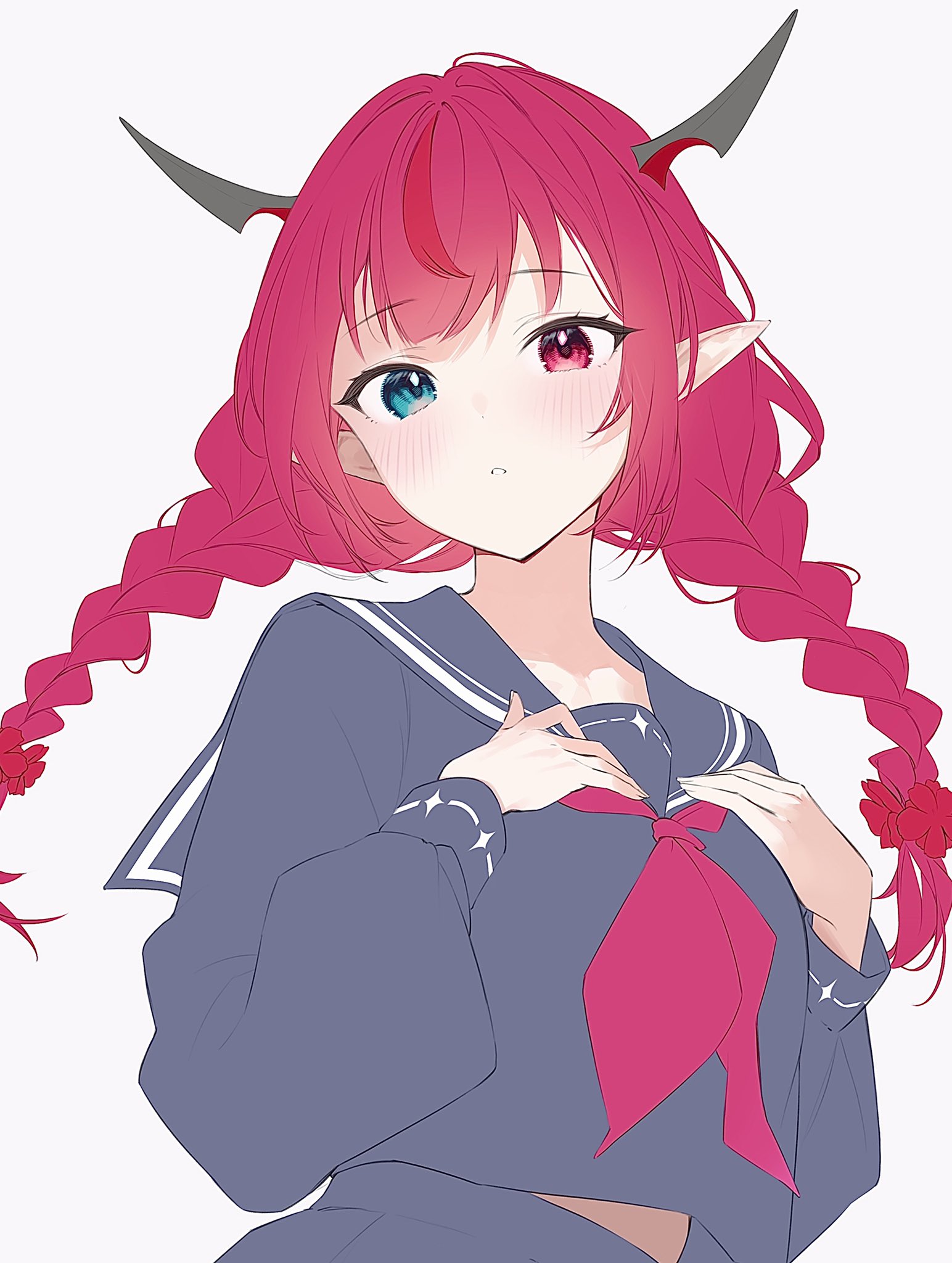 1girl artistic_error black_horns black_sailor_collar black_serafuku black_skirt blue_eyes blush braid demon_girl demon_horns hand_on_own_chest heterochromia highres hololive hololive_english horns irys_(gaming_casual)_(hololive) irys_(hololive) long_sleeves looking_at_viewer low_twin_braids midriff_peek multicolored_hair neckerchief official_alternate_costume official_alternate_hairstyle open_mouth puffy_long_sleeves puffy_sleeves red_eyes red_hair red_neckerchief sailor_collar school_uniform serafuku simple_background skirt solo soybean_(hisoybean) streaked_hair twin_braids virtual_youtuber white_background