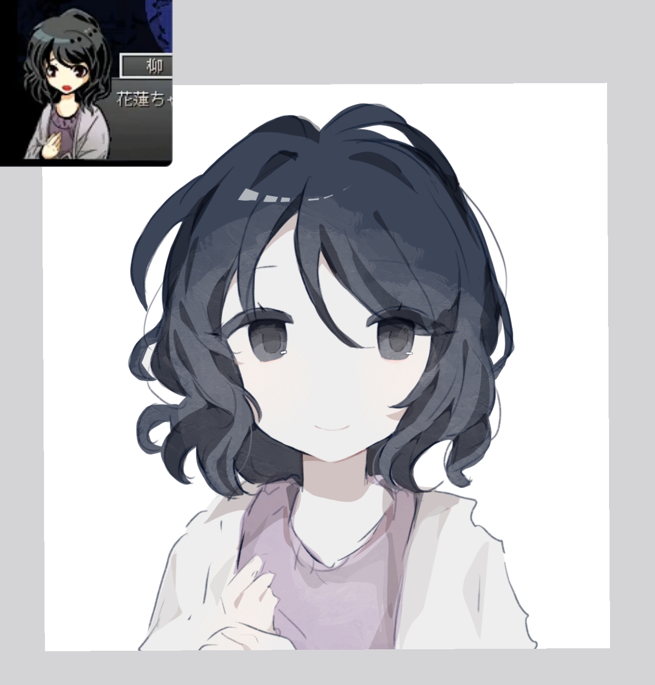 1girl black_eyes black_hair closed_mouth eyes_visible_through_hair fen_mao_yanjing_chu game_screenshot_inset highres jacket long_sleeves looking_at_viewer no_nose open_clothes open_jacket pale_skin portrait purple_sweater reference_inset saibou_shinkyoku short_hair smile solo sweater white_jacket yanagi_nina