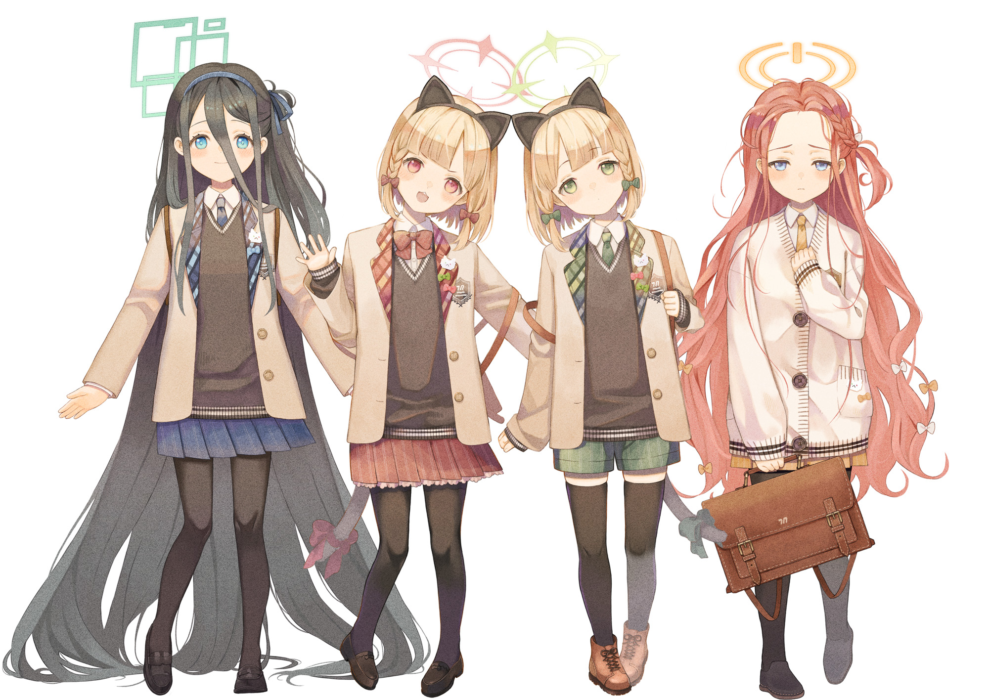 4girls absurdly_long_hair alternate_costume animal_ear_hairband animal_ears aqua_halo aris_(blue_archive) bag black_footwear black_hair black_pantyhose black_thighhighs black_vest blazer blonde_hair blue_archive blue_eyes blue_hairband blue_necktie blue_skirt blush bow bowtie cardigan cat_ear_hairband cat_ears fake_animal_ears fake_tail forehead full_body game_development_department_(blue_archive) green_bow green_eyes green_halo green_necktie green_shorts hair_between_eyes hair_bow hairband halo hand_up head_tilt highres jacket long_hair long_hair_between_eyes long_sleeves looking_at_viewer midori_(blue_archive) momoi_(blue_archive) multiple_girls multiple_hair_bows necktie one_side_up open_clothes open_jacket open_mouth orange_halo original-orange-610917 pantyhose pink_eyes pink_halo rectangular_halo red_bow red_bowtie red_hair red_skirt ringed_eyes school_bag shirt short_hair shorts siblings sisters skirt smile standing tail thighhighs twins very_long_hair vest white_background white_cardigan white_shirt yellow_necktie yuzu_(blue_archive)
