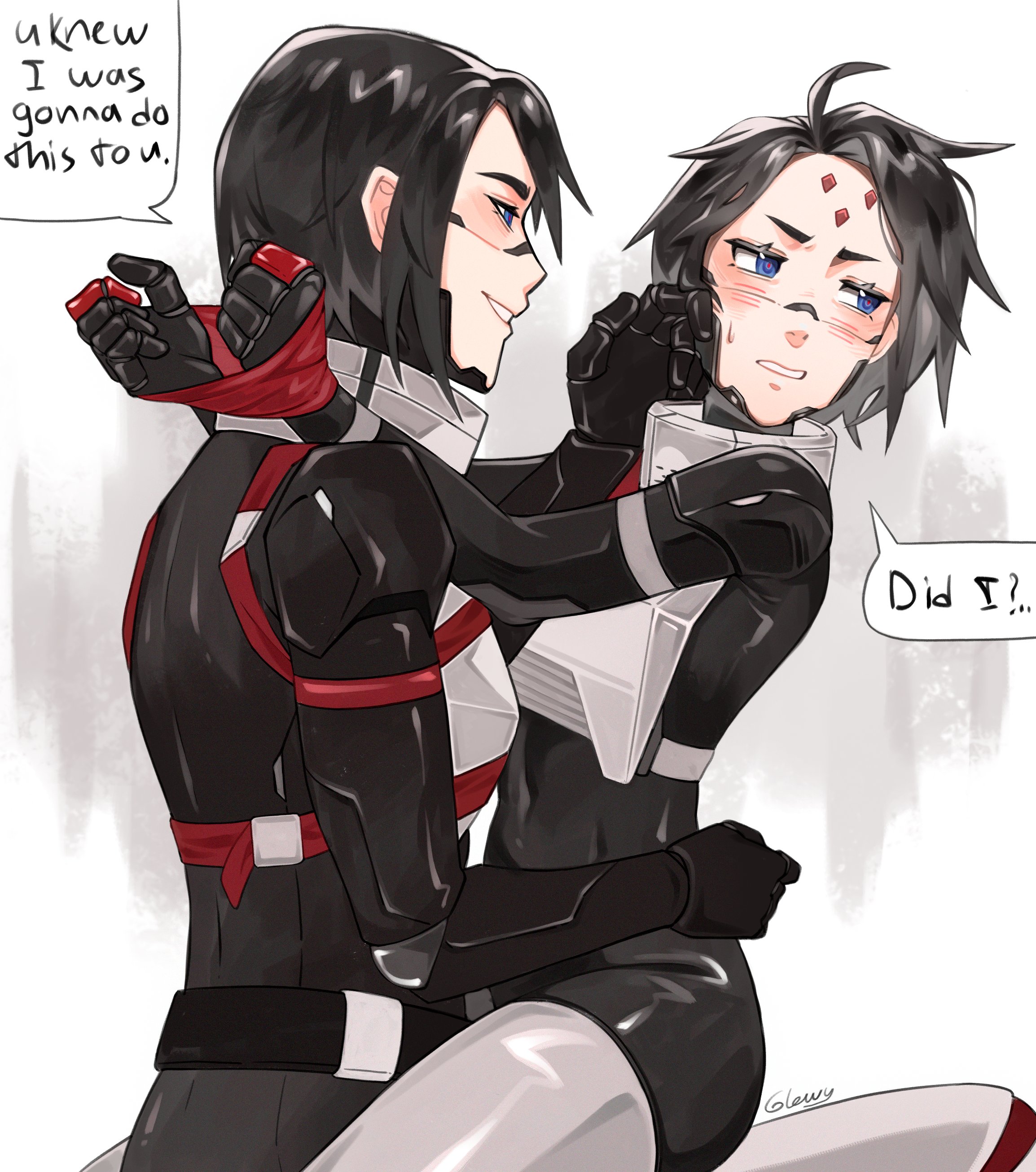 2girls absurdres android armor artist_name black_hair blue_eyes bound breastplate commentary english_text glowy_(gloww) hand_on_another's_cheek hand_on_another's_face height_difference highres humanoid_robot kolibri_(signalis) mechanical_arms mechanical_legs mechabare messy_hair multiple_girls robot robot_girl short_hair signalis sitting smile speech_bubble storch_(signalis) sweatdrop tape tied_up_(nonsexual) white_background yuri