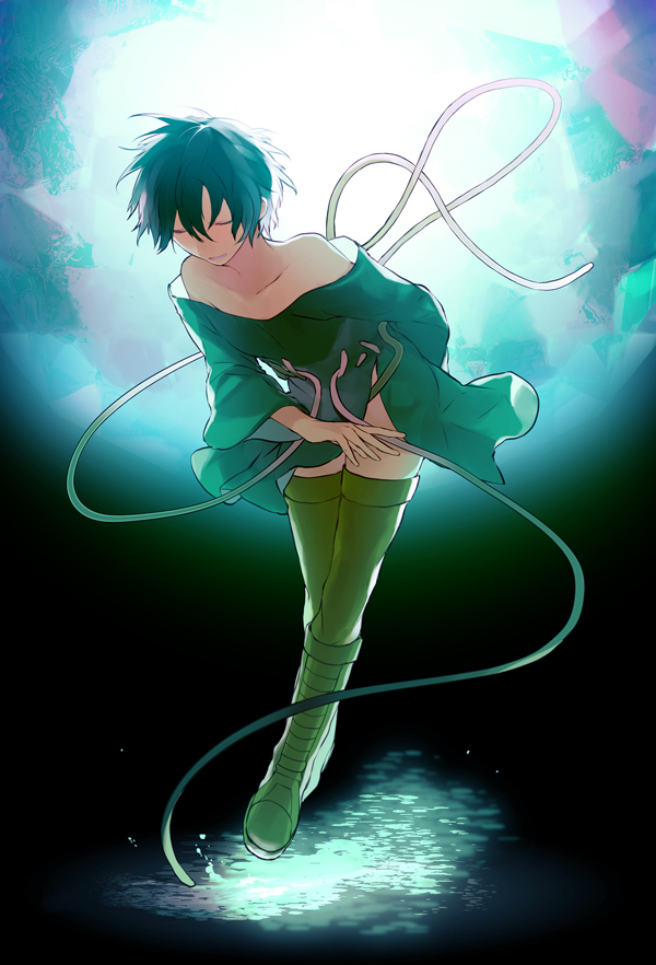 1girl akio_(89e) alice_(baroque) arm_behind_back baroque_(series) boots bowing closed_eyes dress full_body glowing green_boots green_dress green_hair green_thighhighs knee_boots off-shoulder_dress off_shoulder parted_lips short_hair smile solo thighhighs wire