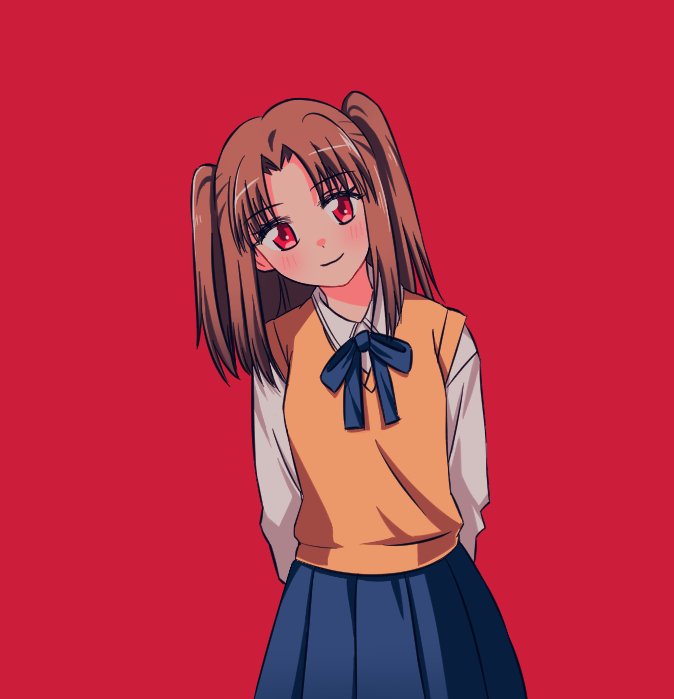 arms_behind_back blue_ribbon blue_skirt blush brown_hair cardigan kimleepark1129 looking_at_viewer red_eyes ribbon skirt tsukihime twintails yellow_cardigan yumizuka_satsuki