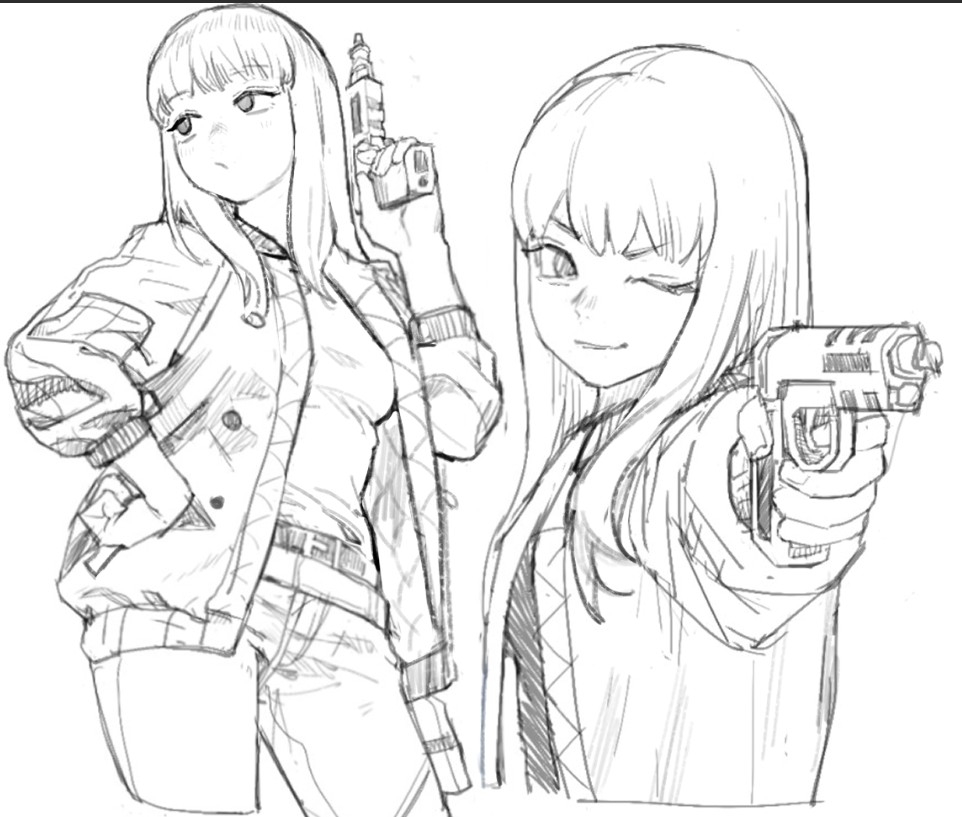 1girl :/ aiming belt breasts chinese_commentary commentary_request contrapposto finger_on_trigger greyscale gun hand_on_own_hip holding holding_gun holding_weapon kiruko_(tengoku_daimakyou) long_bangs long_hair medium_breasts monochrome one_eye_closed pants sketch smile solipsist solo tengoku_daimakyou v-shaped_eyebrows weapon