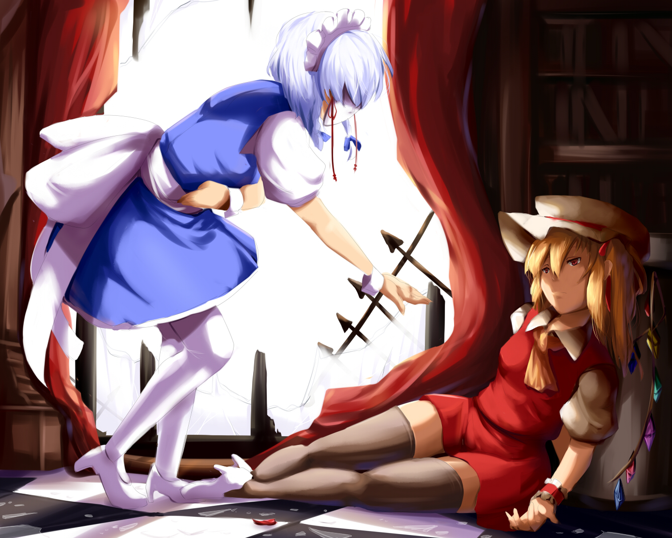 2girls ascot back_bow black_thighhighs blonde_hair blue_hair blue_skirt blue_vest book bookshelf bow breasts broken_window checkered_floor closed_mouth collared_shirt curtains flandre_scarlet from_side full_body hair_between_eyes hat hat_ribbon high_heels huge_bow indoors izayoi_sakuya large_bow light_blue_hair looking_at_another magukappu maid maid_headdress mask mob_cap multicolored_wings multiple_girls on_floor outstretched_arm pantyhose puffy_short_sleeves puffy_sleeves curtains red_eyes red_ribbon ribbon shirt short_sleeves skirt skirt_set small_breasts standing thighhighs touhou vest white_bow white_footwear white_headwear white_mask white_pantyhose white_shirt wings wrist_cuffs yellow_ascot