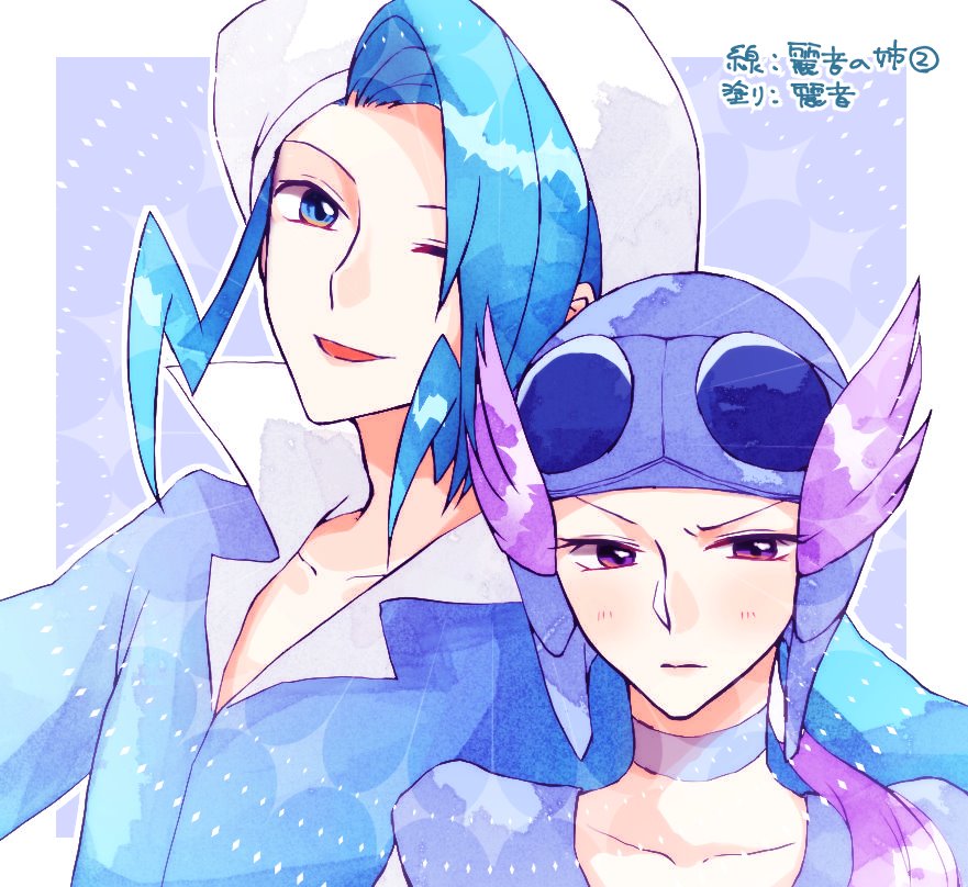 1boy 1girl alternate_costume aqua_eyes aqua_hair blue_bodysuit blue_shirt blush bodysuit collarbone goggles goggles_on_head half-closed_eyes helmet hibikileon long_sleeves nintendo one_eye_closed pilot_helmet pilot_suit pokemon pokemon_ruby/sapphire/emerald ponytail purple_eyes purple_hair shirt unitard wallace_(pokemon) white_headwear winona_(pokemon)