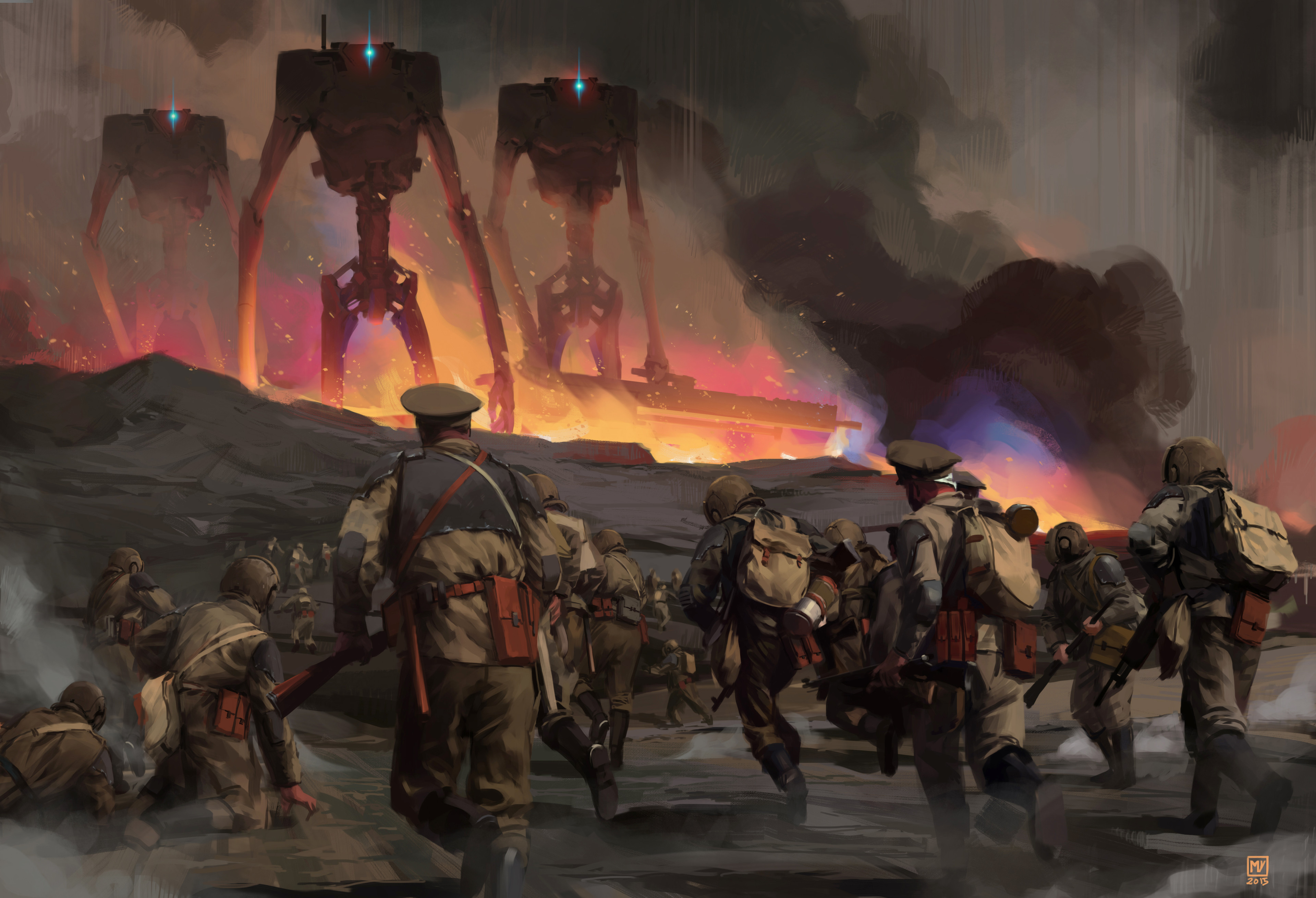 6+boys absurdres ammunition_pouch army artist_logo backpack bag battlefield belt black_footwear boots brush_stroke dated elbow_pads embers facing_away fire fog from_behind giant glowing grey_sky gun hat highres hill holding holding_gun holding_weapon kneeling logo mecha merchandise_available miguel_iglesias military military_uniform multiple_boys original outdoors pants pants_tucked_in peaked_cap pouch rifle robot running science_fiction shoe_soles shoulder_pads sky smoke soldier war weapon wide_shot