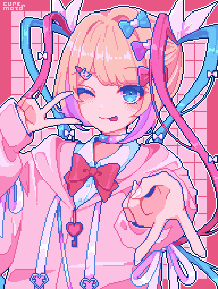 1girl :p artist_name blonde_hair blue_bow blue_eyes blue_hair bow bowtie cat_hair_ornament chouzetsusaikawa_tenshi-chan chouzetsusaikawa_tenshi-chan_(needy_girl_overdose_exhibition) grid_background hair_bow hair_ornament hair_ribbon heart highres hood hoodie kyua_moto long_hair looking_at_viewer multicolored_hair needy_girl_overdose one_eye_closed outline pink_background pink_bow pink_bowtie pink_hair pink_hoodie pixel_art purple_bow quad_tails ribbon shirt sidelocks solo tongue tongue_out v white_outline white_ribbon white_shirt