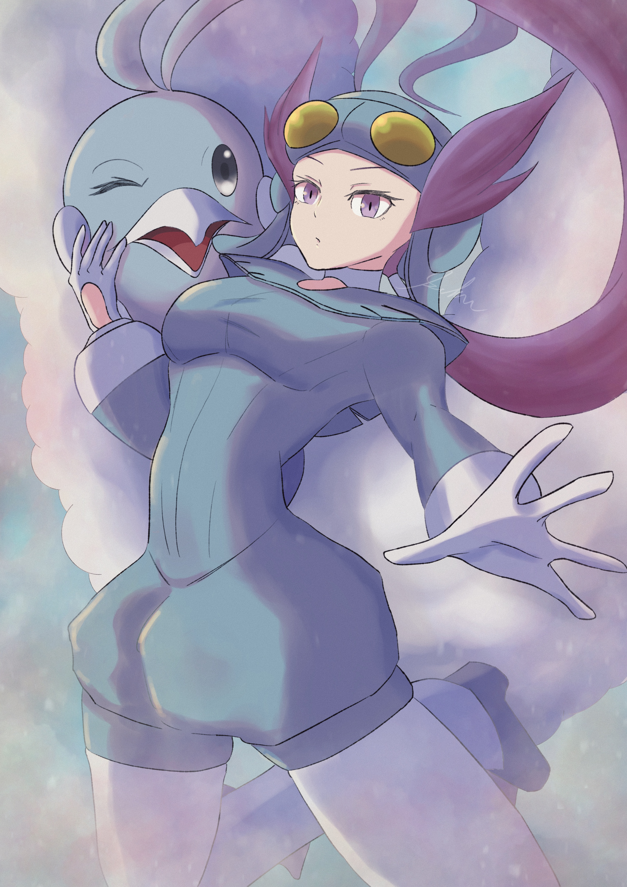 1girl absurdres altaria bird black_eyes blue_suit breasts dragon fluffy formal_clothes gen_3_pokemon goggles goggles_on_head helmet highres long_hair medium_breasts nintendo pilot_helmet pilot_suit pokemon pokemon_(creature) pokemon_omega_ruby_and_alpha_sapphire ponytail purple_eyes purple_hair suit unitard uyoto winona_(pokemon)