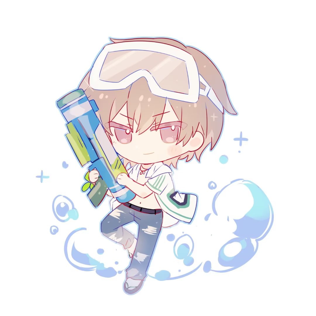 1boy blonde_hair blue_pants brown_dust_(series) brown_dust_2 bubble chibi closed_mouth denim diving_mask diving_mask_on_head full_body goggles goggles_on_head gray_(brown_dust) hair_between_eyes holding holding_water_gun jeans looking_at_viewer luppykiy navel open_clothes open_shirt pants red_eyes shirt short_hair simple_background smile solo standing standing_on_one_leg torn_clothes torn_jeans torn_pants water_gun white_background white_shirt