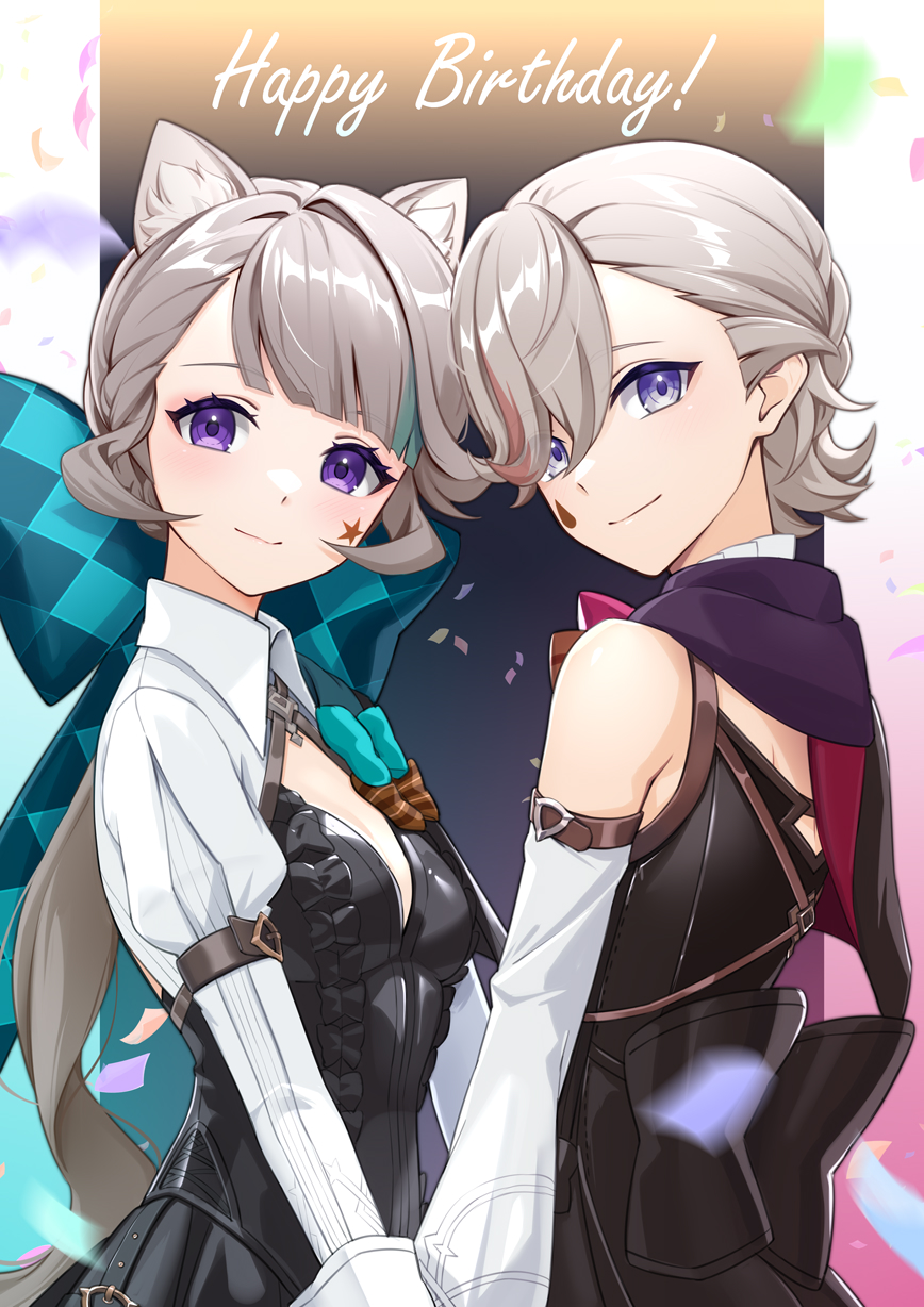 1boy 1girl animal_ear_fluff animal_ears black_headwear blonde_hair bow breasts brother_and_sister cat_ears cat_girl cat_tail closed_mouth facial_mark genshin_impact happy_birthday highres long_hair long_sleeves looking_at_viewer lynette_(genshin_impact) lyney_(genshin_impact) medium_breasts purple_eyes short_hair siblings smile star_(symbol) star_facial_mark tail teardrop_facial_mark tyenka7728
