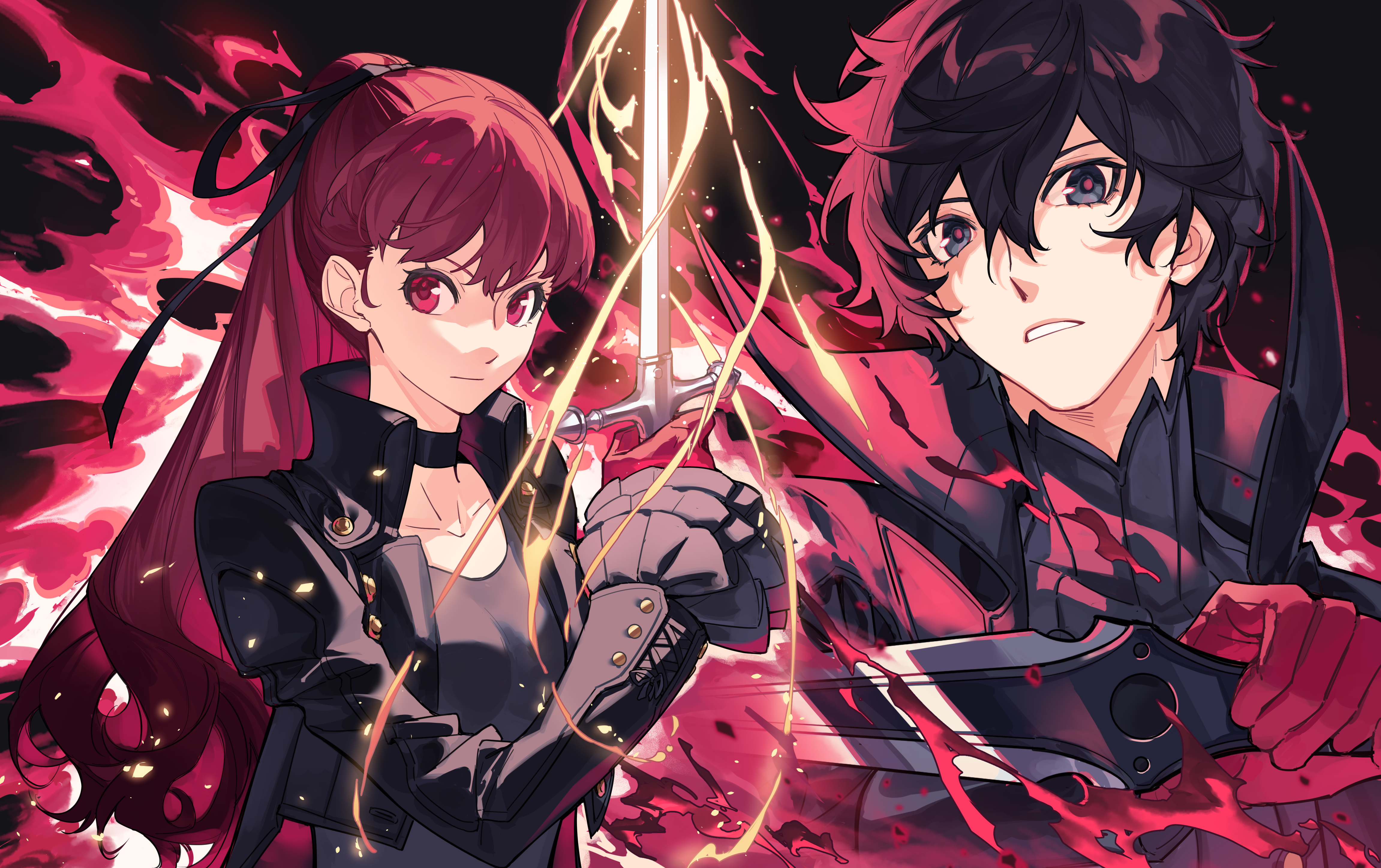1boy 1girl absurdres amamiya_ren black_hair black_jacket breasts dagger gloves hair_between_eyes hair_ribbon highres holding holding_dagger holding_knife holding_weapon jacket knife long_hair long_sleeves looking_at_viewer open_mouth persona persona_5 persona_5_the_royal ponytail rapier red_eyes red_gloves red_hair red_theme ribbon serious short_hair small_breasts sword tsubsa_syaoin violet_(persona_5) weapon yoshizawa_kasumi