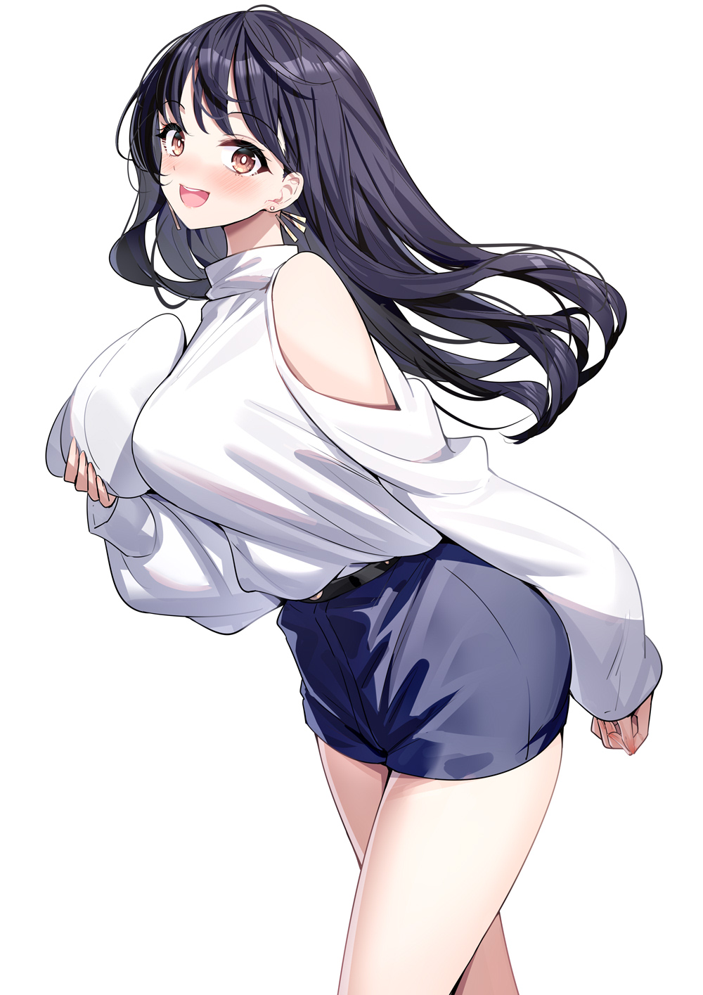 1girl :d black_hair blue_shorts blush boku_no_kokoro_no_yabai_yatsu brown_eyes clothing_cutout commentary_request earrings hat highres holding holding_unworn_clothes holding_unworn_hat jewelry leaning_forward long_hair long_sleeves open_mouth peaked_cap puffy_long_sleeves puffy_sleeves ririko_(zhuoyandesailaer) round_teeth shirt short_shorts shorts shoulder_cutout simple_background sleeves_past_wrists smile solo teeth unworn_hat unworn_headwear upper_teeth_only white_background white_hat white_shirt yamada_anna