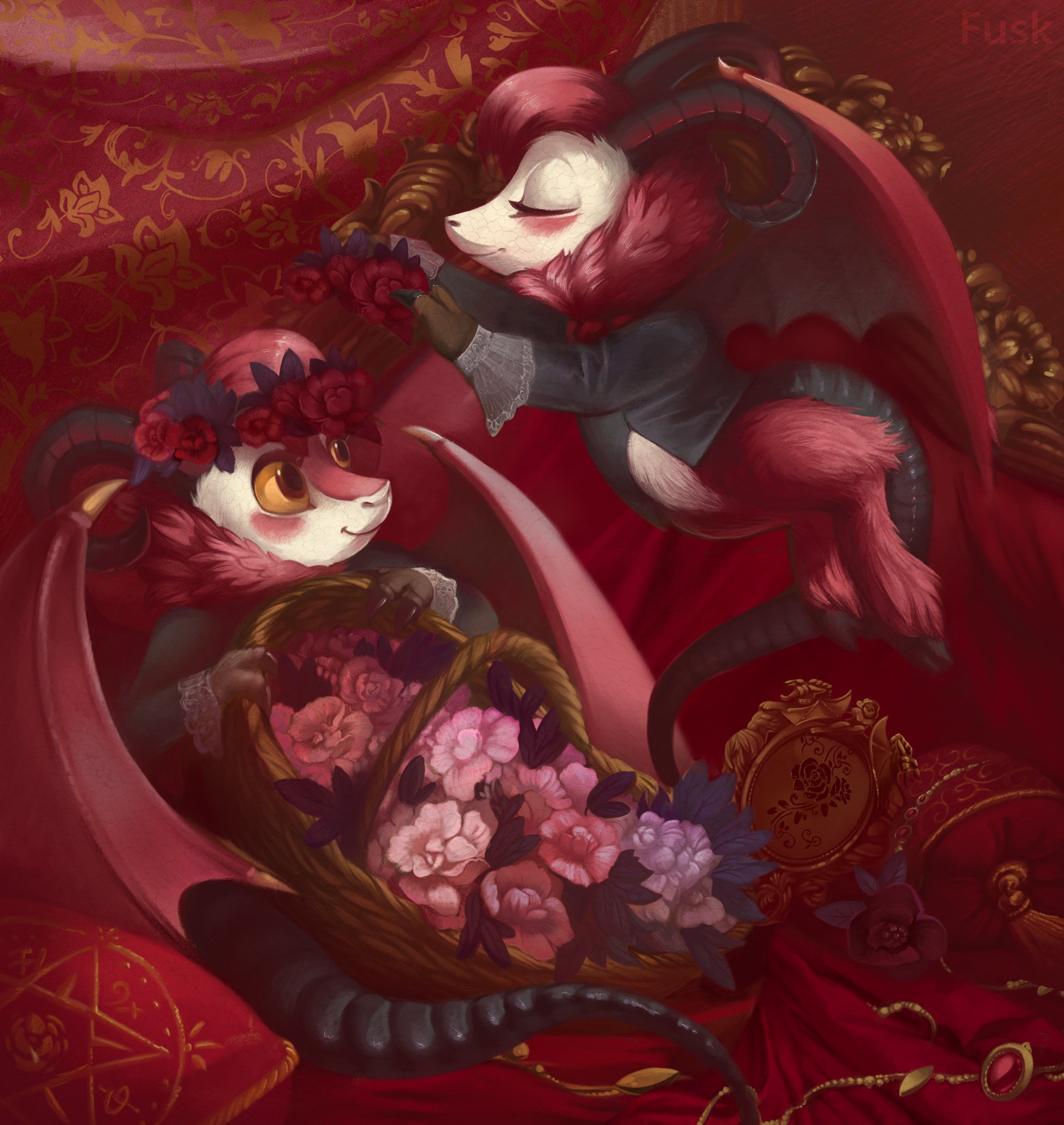 2boys aber_fusk basket black_horns black_suit black_tail brothers closed_eyes closed_mouth colored_sclera curled_horns curtains dazzle_(hazbin_hotel) demon demon_boy demon_horns demon_wings dragon_horns dragon_wings flower formal_clothes gem goat goat_horns hazbin_hotel head_wreath hellaverse highres holding holding_basket holding_flower hooves horns looking_at_another lying multiple_boys no_humans pillow pink_flower razzle_(hazbin_hotel) red_eyes red_flower red_fur red_wings siblings smile suit twins wings yellow_sclera