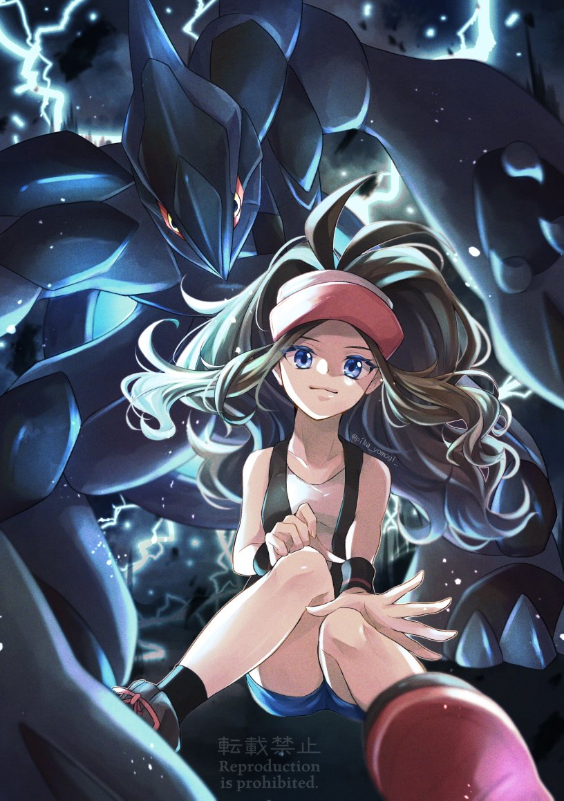 1girl aura baseball_cap black_skin blue_eyes blue_shorts brown_hair closed_mouth collarbone colored_skin commentary_request electricity eyelashes gen_5_pokemon hat hilda_(pokemon) legendary_pokemon long_hair nintendo pokemon pokemon_(creature) pokemon_black_and_white red_eyes shirt shorts sitting smile translation_request white_shirt yomogi_(black-elf) zekrom zekrom_(overdrive)