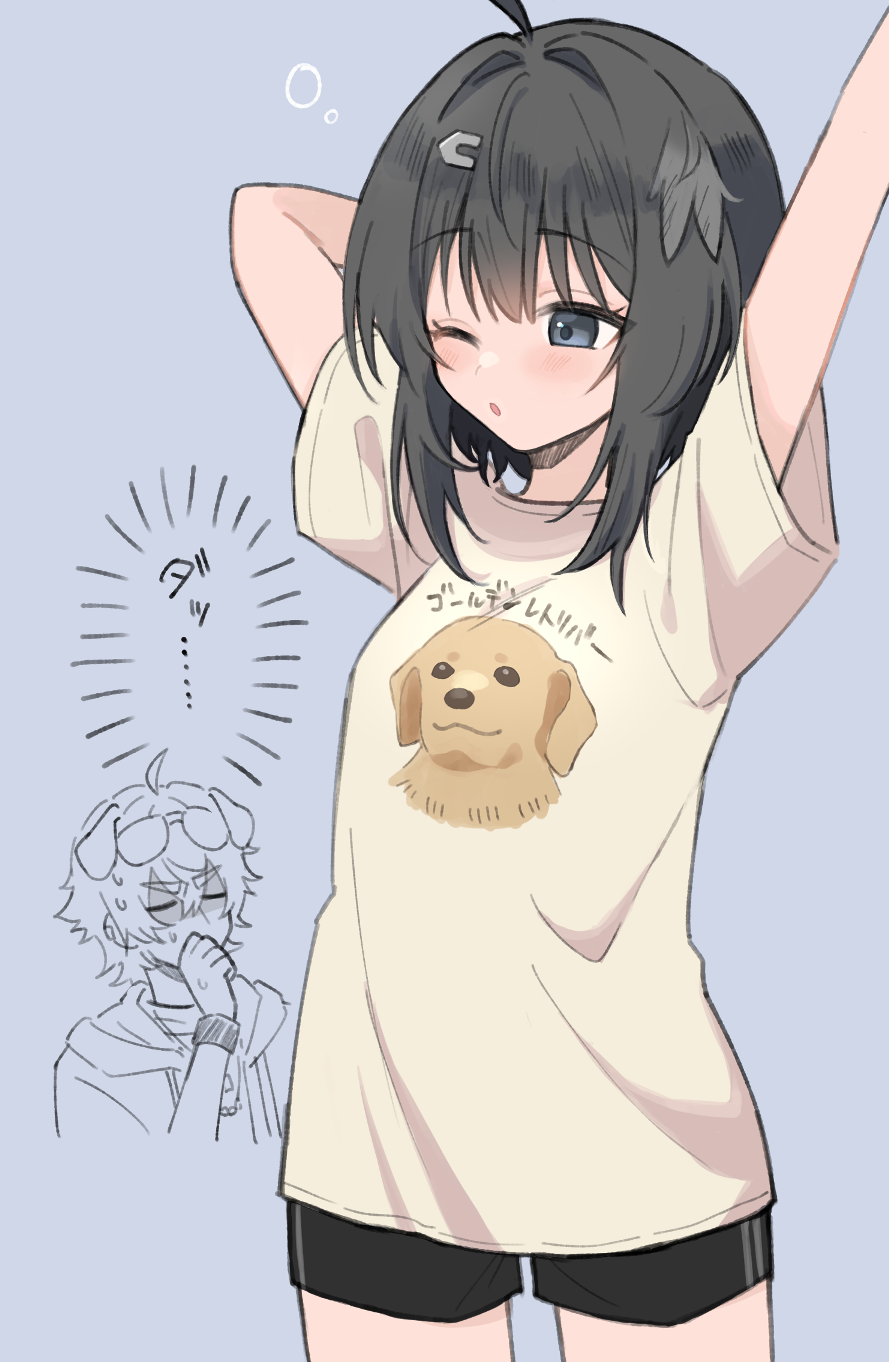 1boy 1girl ;o alternate_costume animal_ears animal_print arknights arms_up black_hair black_shorts blank_speech_bubble blue_background blue_eyes blush bracelet breasts brother_and_sister casual closed_eyes clothes_writing cowboy_shot dog_boy dog_ears dog_print eyewear_on_head feather_hair grey_background hair_ornament hairclip highres jewelry la_pluma_(arknights) one_eye_closed parted_lips print_shirt shaded_face shirt short_hair short_shorts shorts siblings simple_background small_breasts speech_bubble step-siblings stretching sweat tequila_(arknights) translation_request v-shaped_eyebrows yellow_shirt yoshikichi