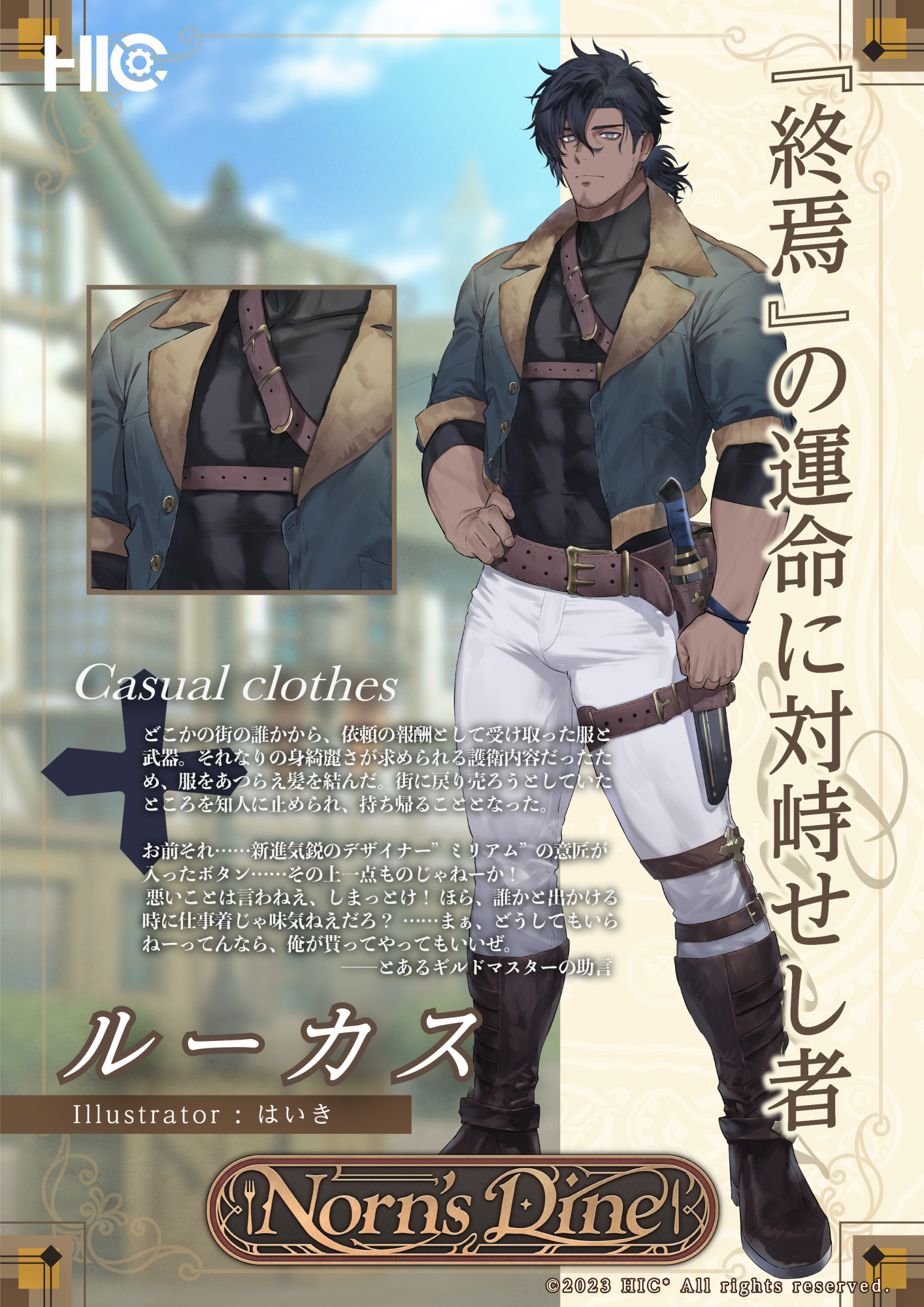 1boy bara black_hair black_shirt blue_jacket boots closed_mouth copyright_name dark-skinned_male dark_skin english_text facial_hair haiki_(tegusu) highres jacket large_pectorals lucas_(norn's_dine) male_focus muscular muscular_male norn's_dine official_art open_clothes open_jacket pants pectorals sheath sheathed shirt short_hair translation_request weapon white_pants