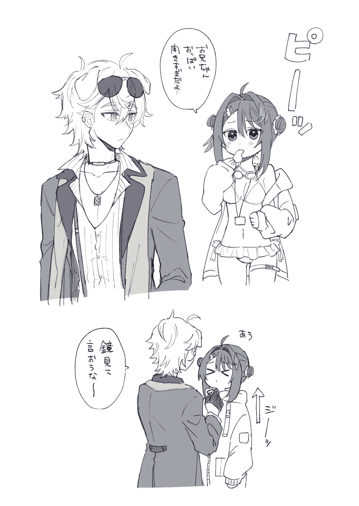 1boy 1girl ahoge arknights arrow_(symbol) bikini bikini_skirt breasts brother_and_sister buttons cleavage collarbone collared_shirt double_bun eyewear_on_head goggles goggles_around_neck greyscale hair_between_eyes hair_bun hair_intakes hair_ornament hairclip highres id_card jacket jewelry la_pluma_(arknights) la_pluma_(summer_flowers)_(arknights) lanyard long_sleeves looking_at_another medium_breasts monochrome mouth_hold multiple_views navel necklace off_shoulder open_clothes open_collar open_jacket pendant pinstripe_pattern pinstripe_shirt shirt short_hair siblings sidelocks sound_effects stomach sunglasses swimsuit tequila_(arknights) tequila_(cardwinner)_(arknights) thigh_strap v-neck whistle yoshikichi zipper zipping